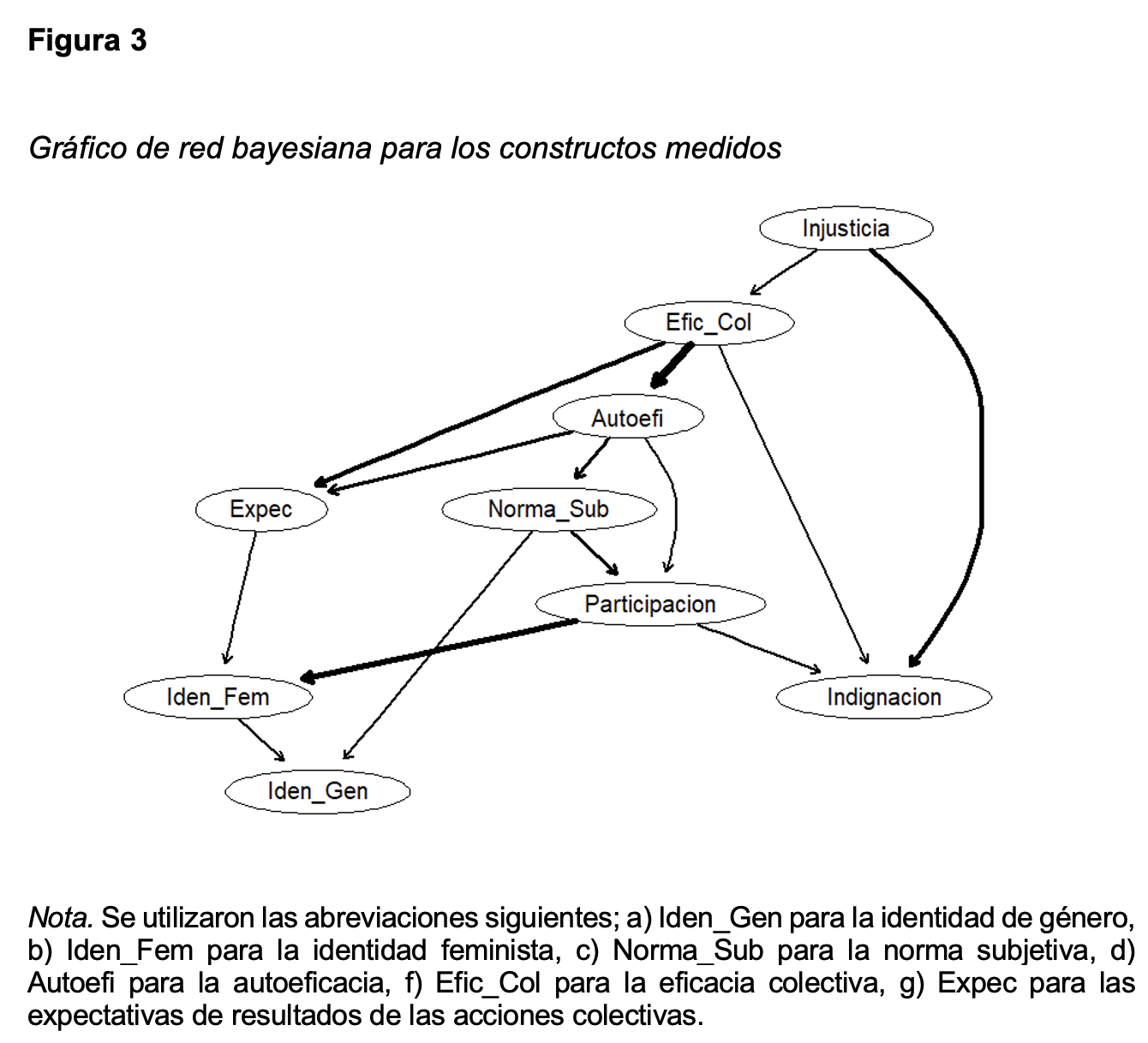 En el gráfico de la red acíclica (red bayesiana; Figura 3) se muestran las relaciones de dependencia probabilística, mientras más gruesa es la flecha entre dos nodos, más importante es la conexión para el buen ajuste de la red. En la Figura 3 se puede observar que la percepción de injusticia se desprenden una conexión débil hacia la eficacia colectiva y una fuerte hacia la indignación. De la eficacia colectiva se desprenden una flecha fuerte hacia la autoeficacia, una con fuerza media hacia las expectativas de resultados y una débil hacia la indignación. Al mismo tiempo, se puede observar que la participación en acciones colectivas es influida por la autoeficacia y la norma subjetiva directamente y por la injusticia y la eficacia colectiva indirectamente (a través de la autoeficacia). Por último, se puede observar que la participación en acciones colectivas influyó sobre la indignación de forma débil y sobre la identidad feminista de forma fuerte para la red.
