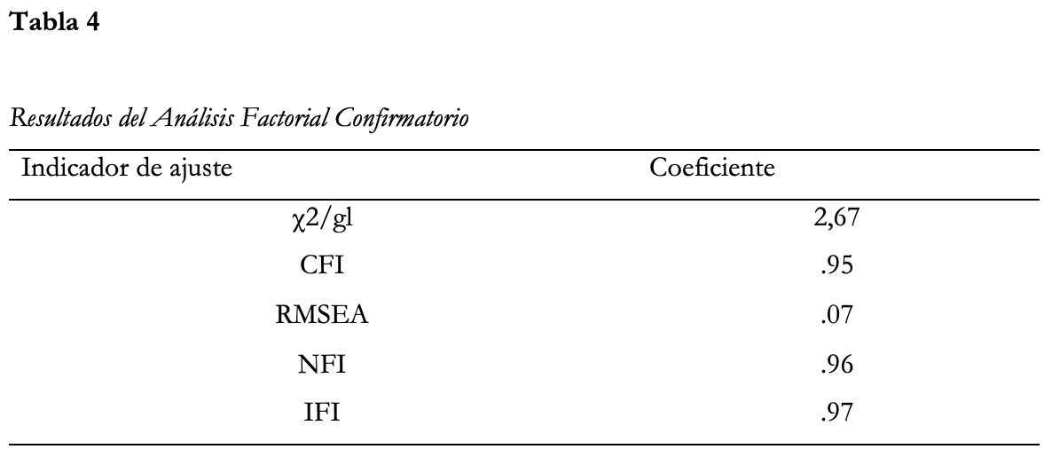 Posteriormente se realizó un análisis factorial confirmatorio basado en el método de ecuaciones estructurales (Byrne, 2001; Kline, 2005), para este análisis se fijaron las varianzas de los términos de error como parámetros libres y se utilizó la estimación de máxima verosimilitud. Los índices de bondad de ajuste utilizados fueron la X2 (este cociente se dividió entre los grados de libertad y para considerar un buen ajuste el resultado debe ser < 4), el índice de ajuste comparativo de Bentler (CFI) (cuanto más se acerque el valor a .90, mejor será el ajuste) y el error cuadrático medio de aproximación (RMSEA; un ajuste relativo > .90 se considera generalmente un buen ajuste); el índice de ajuste normalizado (NFI) y el índice de ajuste incremental (IFI) en estos dos indicadores un ajuste relativo > .90 se considera en general un buen ajuste.
