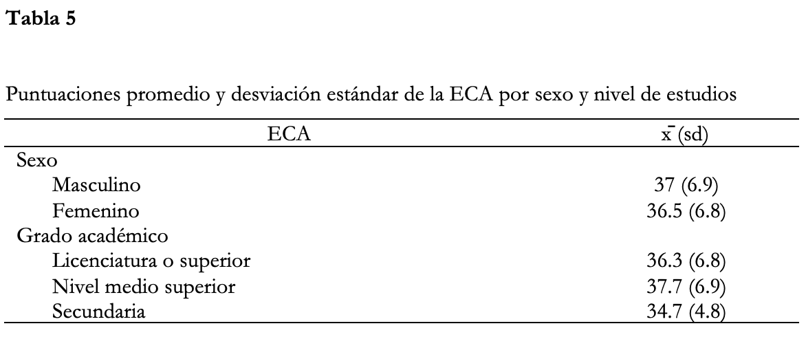 Por otra parte, se identificó que la puntuación promedio de la ECA obtenida por los participantes del estudio fue de 36.6 (sd= 6.8), y no se encontraron diferencias significativas en el puntaje de acuerdo al género, ni al nivel educativo de los participantes. En la Tabla 5 es posible observar las puntuaciones promedio obtenidas en la ECA de acuerdo a estas variables de agrupación.