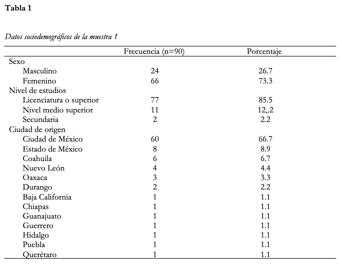 En la primera muestra para el análisis factorial exploratorio, los participantes tuvieron una edad promedio de 41.49 años, 66 (73.3%) participantes eran mujeres, 24 (26.7%) eran hombres, en relación al nivel educativo la mayoría contaban con estudios de nivel licenciatura o superior (85.5%) y en relación a la ciudad de origen de estos participantes, la mayoría eran de la Ciudad de México (66.7%) y del Estado de México (8.9%), los datos de esta muestra fueron colectados entre los meses de enero y marzo de 2019. En la Tabla 1 se pueden observar con mayor detalle las características sociodemográficas de los participantes de esta muestra.