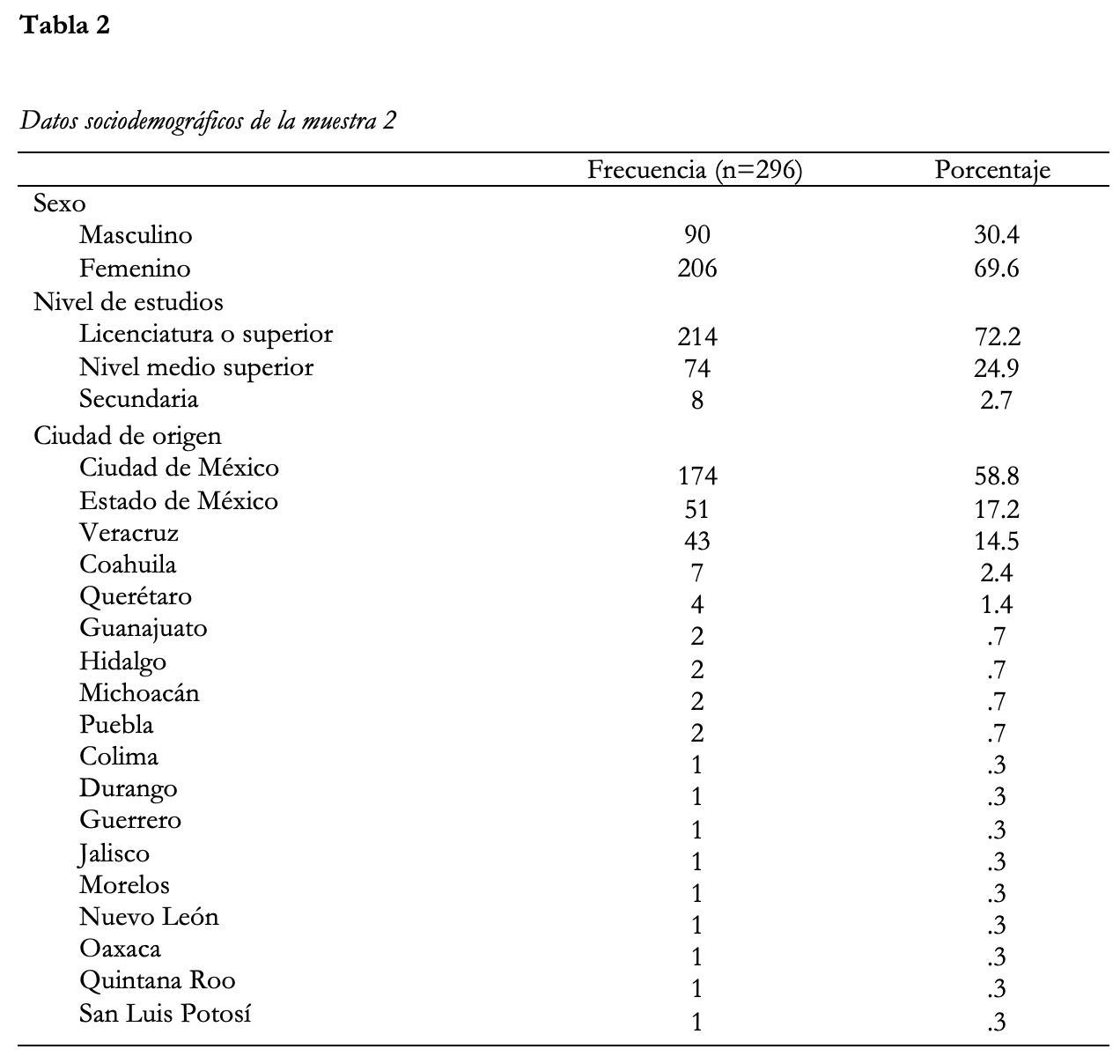 En la segunda muestra con la cual se llevó a cabo el análisis factorial confirmatorio, los participantes tuvieron una edad promedio de 36.5 años, 206 (69.6%) eran mujeres, 90 (30.4%) eran hombres, 214 (72.2%) contaban con estudios profesionales y pertenecían a diferentes estados de la República Mexicana. Los datos de esta muestra se recolectaron en los meses de noviembre de 2019 a marzo de 2020, en la Tabla 2 se pueden consultar con mayor detalle los datos sociodemográficos de estos participantes.