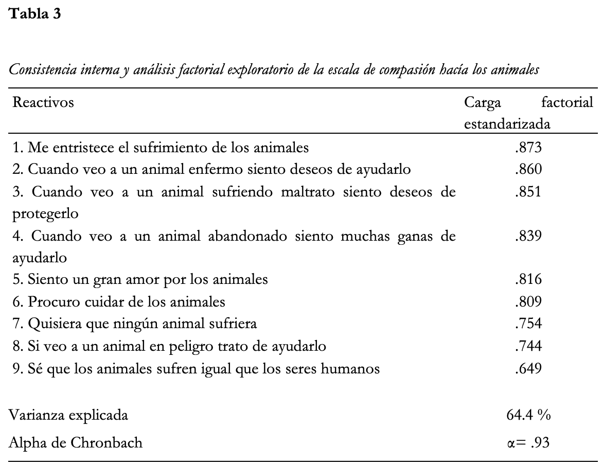 La estructura unifactorial del instrumento difiere de estudios previos en los que se han comprobado estructuras de por lo menos dos factores (Chang et al., 2014; López-Tello & Moreno-Coutiño, 2019; Martins et al., 2013; Sprecher & Fehr, 2005), sin embargo, es importante considerar que estos estudios tenían como objetivo principal la evaluación de la compasión entre seres humanos. Esto nos permite cuestionar si la investigación sobre compasión hacia los animales puede diferir en la cantidad de factores involucrados y de ser así, resultaría interesante para futuras investigaciones identificar las variables que podrían estar mediando esta diferencia en el número de factores, además es recomendable que futuros estudios investiguen la percepción de semejanzas y la aceptación o rechazo de cualidades psicológicas entre humanos y animales, debido a que esta parece ser una variable que puede moderar la respuesta del ser humano ante el sufrimiento animal (Bastian, Loughnan, et al., 2012; Bilewicz et al., 2011; Bratanova et al., 2011; Butterfield et al., 2012; Herzog, 2010; Kiesler et al., 2006).