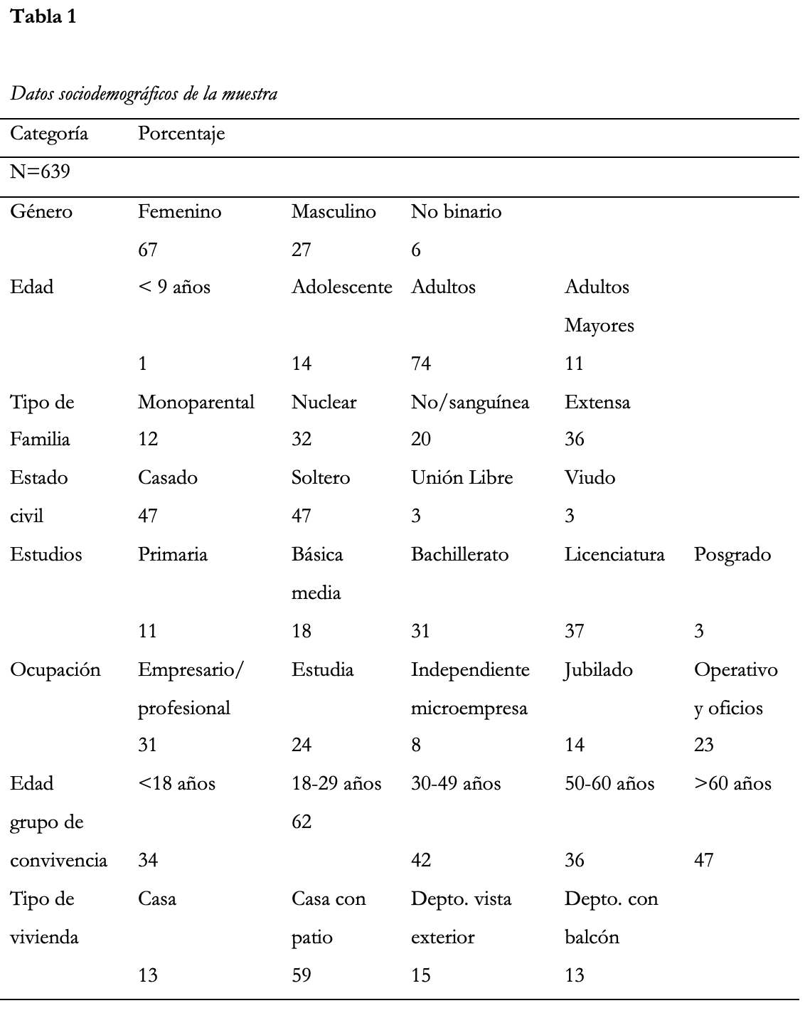 Se invitó a 697 pacientes, de los cuales aceptaron participar 639. Como se puede observar en la Tabla 1, la mayoría de los participantes fueron de género femenino (67%). El grupo de edad predominante en la muestra se compuso por adultos (74%). El tipo de familia mayoritario fue la familia extensa (36%), seguido por la familia nuclear (32%). Respecto al estado civil la mayoría informaron estar casados (47%) o solteros (47%). En relación con grado escolar el 37% poseen una licenciatura terminada y 31% bachillerato terminado. La ocupación con mayor porcentaje fue dedicarse a actividades profesionales o empresariales (31%) y el ser estudiante (24%). Al considerar el rango de edad de las personas con quien conviven los participantes, se observó mayormente el de 18-29 años (62%), seguido por el de personas mayores de 60 años (47%). Sobre los tipos de vivienda, los participantes refirieron cuatro (casa con patio o jardín -la más frecuente 59%-, casa, departamento con vista exterior y departamento con balcón) (Tabla 1).