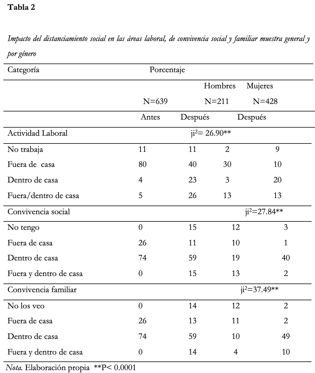 En cuanto al impacto de la pandemia en el ámbito laboral (Tabla 2), se observaron cambios en la actividad de los participantes antes y después de la pandemia. Se puede notar que del 80% que salía de casa a trabajar antes la pandemia, 40% se tuvo que quedar en casa por despidos y restricciones por tener actividad no esencial. Mientras que sólo el 23% pudo quedarse en casa y mantener relativamente estable su empleo y economía. En el caso de quienes sólo estaban en casa o tenían actividades mixtas (dentro y fuera), ahora con la pandemia se notó un aumento importante (19% y 21%, respectivamente), así mismo se observó que el 11% que no trabajaba se mantiene igual (jubilados y/o pensionados, amas de casa o dependientes de sus hijos). Sobre la convivencia social y familiar los datos obtenidos son muy similares la mayoría antes (74%) tenían actividades dentro de casa y fuera el 26%, sin embargo, a partir de la pandemia estos porcentajes se reducen; además el 15% refiere que actualmente no tiene convivencia social y el 14% ha dejado de ver a sus familiares. Finalmente se realizó un análisis de las diferencias por género antes de la pandemia en las variables mencionadas sin encontrar diferencias significativas (ji2=12.39-ji2=50.4; p>.05). A diferencia de después de la pandemia, encontrando diferencias significativas (Tabla 2) dado que más mujeres trabajan dentro de casa y más hombres fuera. Así mismo, la vida social ha cambiado, pues más mujeres socializan dentro de casa. Sobre la convivencia familiar también hay diferencias más mujeres que hombres la viven al interior de casa.