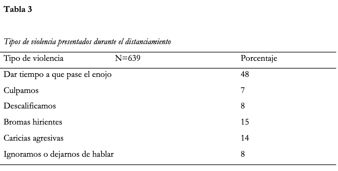 En cuanto a la violencia (Tabla 3), se perciben comportamientos indicados por el violentómetro como alerta moderada en más de la mitad de la población (52%), mientras que el 48% restante dejan pasar tiempo para que se pase el enojo. No se encontraron diferencias de género.
