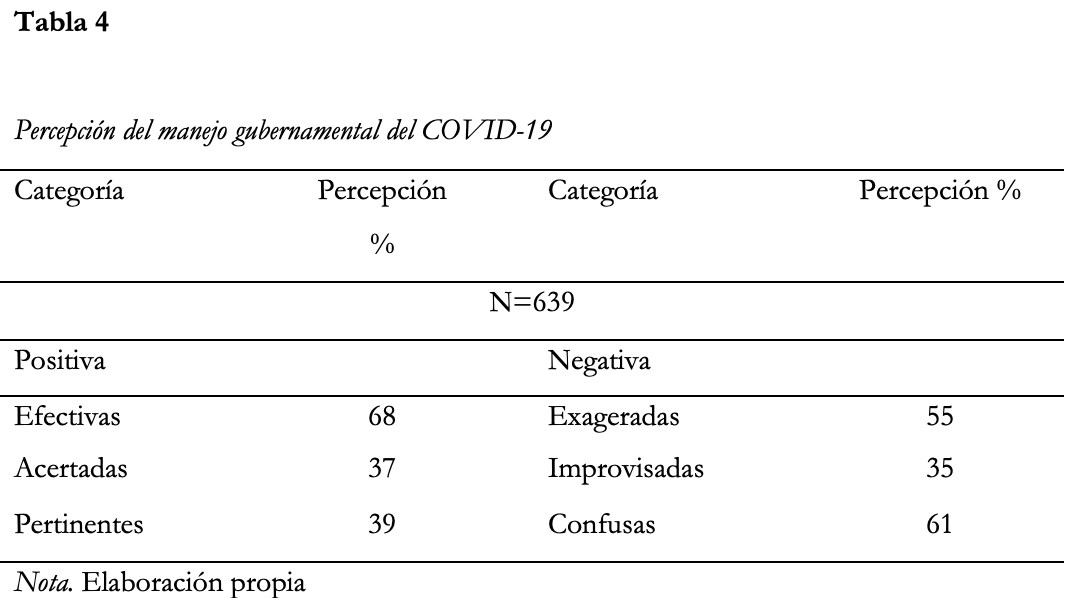 Sobre el manejo gubernamental de la pandemia (Tabla 4), se puede dividirse en positivo, donde el mayor porcentaje se encuentra en la efectividad (68%), y con menor porcentaje califican las medidas como acertadas y pertinentes; en cuanto a los aspectos negativos en el manejo del gobierno, la mayoría lo consideró como confuso (61%) y en menor porcentaje exagerado e improvisado. No se encontraron diferencias de género.