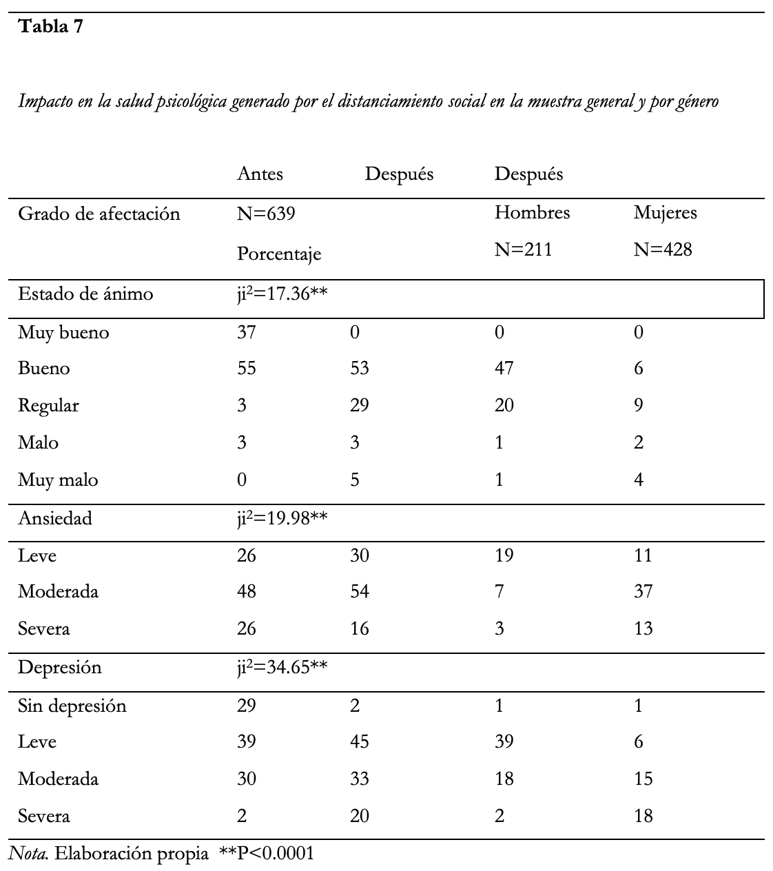 Sobre el estado emocional (Tabla 7), se pudo observar que los participantes presentaron cambios a raíz de la pandemia. Se destaca que el 37% que consideraba su estado de ánimo muy bueno antes de la pandemia, durante el distanciamiento social bajó a 0%. Por el contrario, los porcentajes de los que lo consideraban regular, malo o muy malo aumentaron del 6% al 37%. En lo que respecta a la ansiedad, los que tenían un nivel leve y moderado sólo aumentaron 4 y 6 puntos porcentuales comparando su nivel antes y después de la pandemia. Contrario a esto, las personas con ansiedad severa antes de la pandemia, disminuyeron 10%; lo cual puede atribuirse a los comentarios externados durante las aplicaciones. Ellos coincidían que ante la inseguridad en las calles, era tranquilizante tener a toda la familia en casa. En cuanto a la depresión, se observa un aumento en la presencia de ésta, ya que del 29% que se encontraba sin síntomas depresivos antes de la pandemia, sólo el 2% se mantuvo sin síntomas, por otro lado, se enfatiza el incremento en 18% de personas con sintomatología severa. En relación a las diferencias de género se observan diferencias significativas con mayor afectación en las mujeres (Tabla 7).