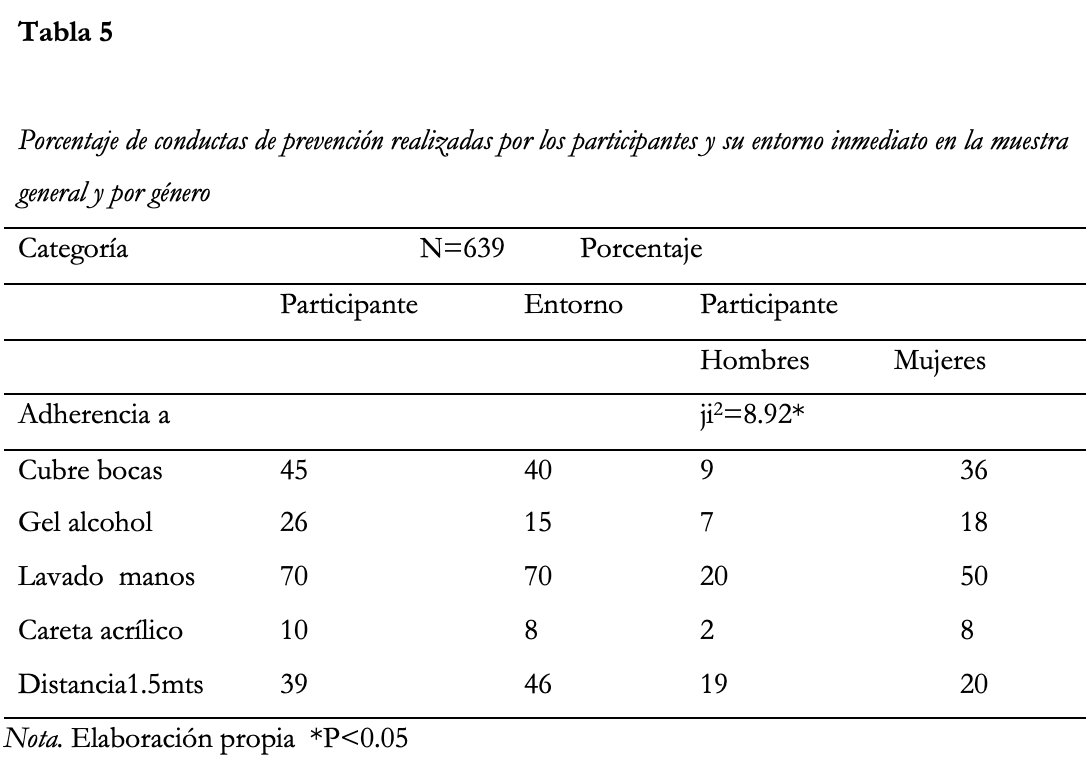 Al indagar sobre la práctica de medidas de prevención (Tabla 5), se tuvo que el 70% se lava las manos y el 45% usa el cubrebocas. Llama la atención que cuando se preguntó sobre la práctica de estas medidas en personas de su entorno inmediato, perciben que las realizan en menor medida que ellos. Se pudo observar que las personas no identifican el distanciamiento social como medida de prevención. Al parecer las personas entienden la función del distanciamiento, pero tienen dificultad para recordarlo y llevarlo a la práctica como una medida preventiva. Ellos consideran que 7% de su entorno practican la distancia social más que ellos (sobre todo jóvenes y menores, quienes les recuerdan que vean las marcas puestas en el piso). Lo cual marca la influencia entre las personas y su entorno en la creación y el establecimiento de normas subjetivas. No se encontraron diferencias de género en la percepción del entorno, no así, en la adherencia de los participantes, pues las mujeres se adhieren mejor (Tabla 5).