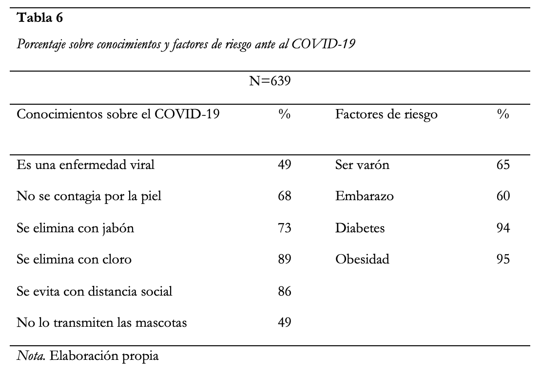 En cuanto al conocimiento sobre COVID-19 (Tabla 6), la mayoría de los participantes saben que es una enfermedad transmitida por virus (49%), que la vía de acceso al cuerpo es por mucosas (ojos, nariz y boca) (68%). Asimismo, identifican que el virus puede ser eliminado con jabón (73%) o cloro (89%), y comprenden que el riesgo de contagio se disminuye con distanciamiento social (86%). Respecto a los factores de riesgo más identificados por los participantes se encuentran la diabetes (94%) y la obesidad (95%); otros factores menos identificados fueron ser varón y estar embarazada. No se encontraron diferencias de género (Tabla 6).