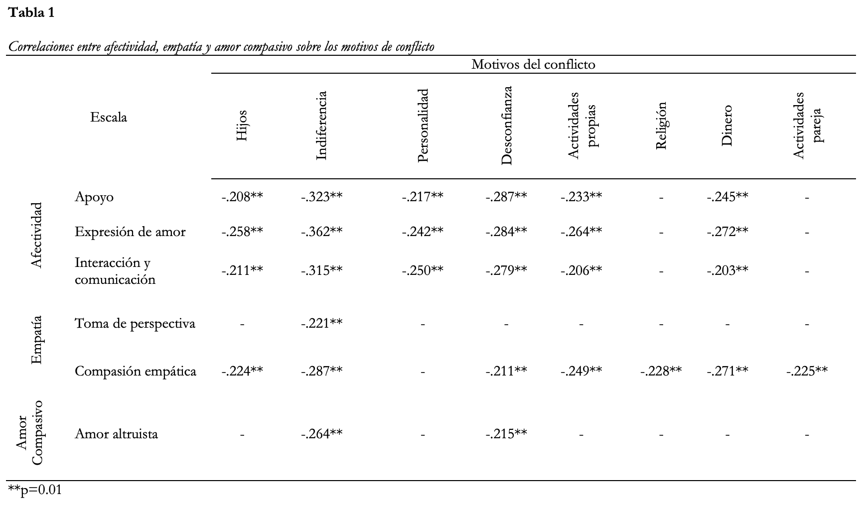 Inicialmente se realizó una prueba de normalidad Kolmogorov Smirnov que indicó que no existe normalidad en los datos (p<.001), por lo que para responder al primer objetivo, orientado a identificar la relación entre la afectividad, la empatía y el amor compasivo con los motivos de conflicto en la pareja, se realizó una correlación de Spearman, que para el factor de afectividad indicó que cuando hay mayor apoyo y cuidado por parte de la pareja, expresiones de cariño y comunicación, menos conflictos hay por los hijos, la indiferencia, la personalidad de ambos miembros, desconfianza, actividades propias y el dinero (ver Tabla 1).