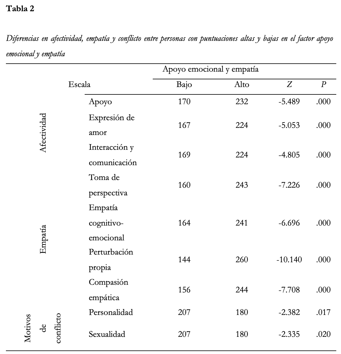 En cuanto a los resultados estadísticamente significativos, indican que el grupo alto en el factor de apoyo emocional y empatía está integrado por personas que, en términos de afectividad, brindan más ayuda y ánimo a su pareja, expresan más amor a nivel verbal y no verbal e interactúan y se comunican más constructivamente en comparación con las personas en el factor bajo. Asimismo, se observó que el grupo alto resultó más empático tanto a nivel cognoscitivo como afectivo al ponerse en el lugar del otro, reconocer y prestar atención a sus emociones y sufrir por lo que le pasa, también en comparación con el grupo bajo en dicho factor. En congruencia, los participantes del grupo alto en apoyo y empatía mostraron menos conflictos con su pareja por cuestiones de personalidad y sexualidad en comparación con sus contrapartes (ver Tabla 2).