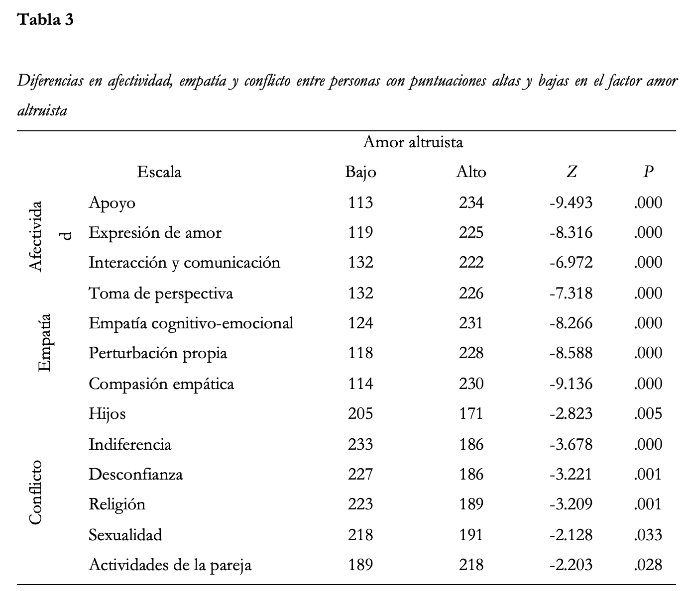 En cuanto a las diferencias en las variables de afectividad, empatía y motivos de conflicto a partir de los niveles alto y bajo en el factor de amor altruista, los datos muestran primero que no hubo discrepancias estadísticamente significativas en personalidad, actividades propias, celos, dinero, familia de origen, familia política y adicciones.
