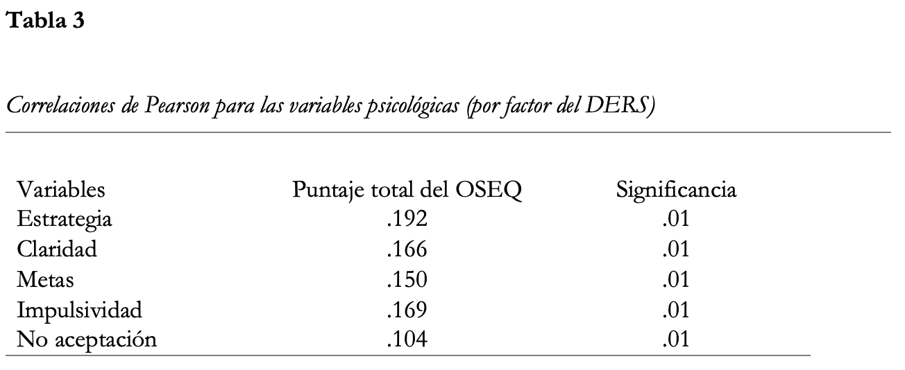 Correlaciones de Pearson para las variables psicológicas (por factor del DERS)
