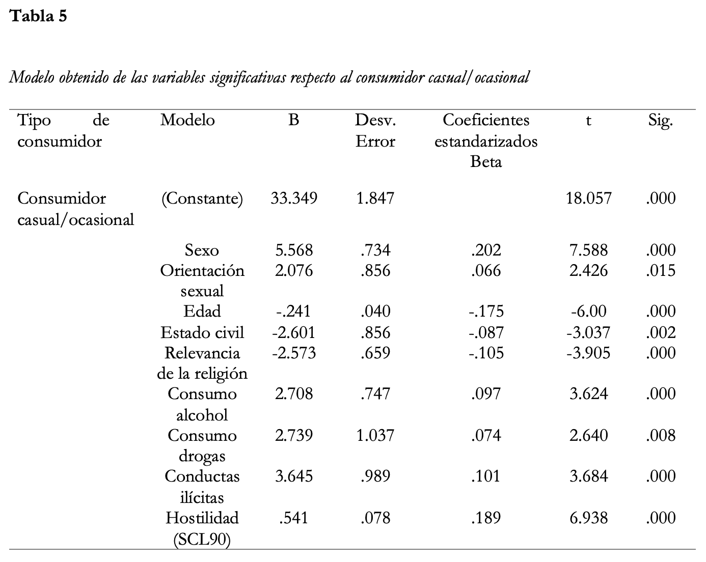Se realizó una regresión lineal múltiple con el método de entrada para las variables que fueron significativas en las correlaciones con la muestra de consumidores ocasionales, obteniéndose el siguiente modelo que explicaba el 22.7 % de la varianza con una F=36.436 p<.001. Tanto las variables sociodemográficas, que se muestran en la Tabla 2, como los factores que componen las variables psicológicas incluidas en el modelo se presentan en la Tabla 5.