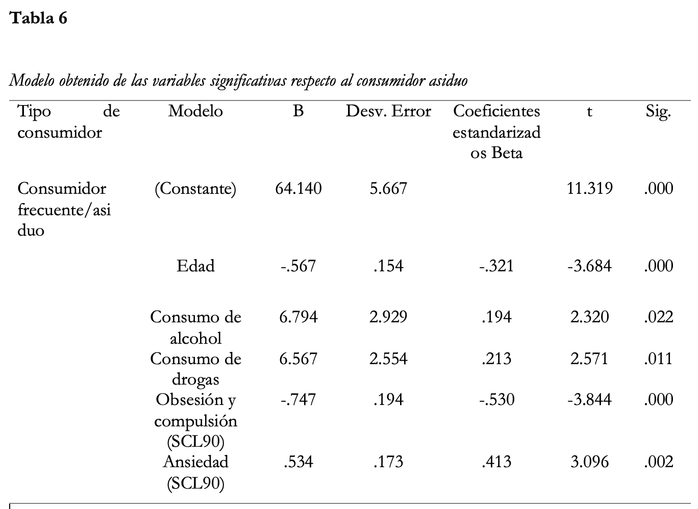 Respecto a las variables psicológicas, se puede referir, acerca de los consumidores asiduos, que encontrar presentes tanto los factores de obsesión-compulsión como los de ansiedad apoya lo mencionado por Wéry y Billieux (2017), Castro, García et al. (2018), Sniewski et al. (2018), Varfi et al. (2019), Luvara et al. (2020) y Ranieri et al. (2021), que indican que dichas variables están relacionadas con los consumidores de ASL.