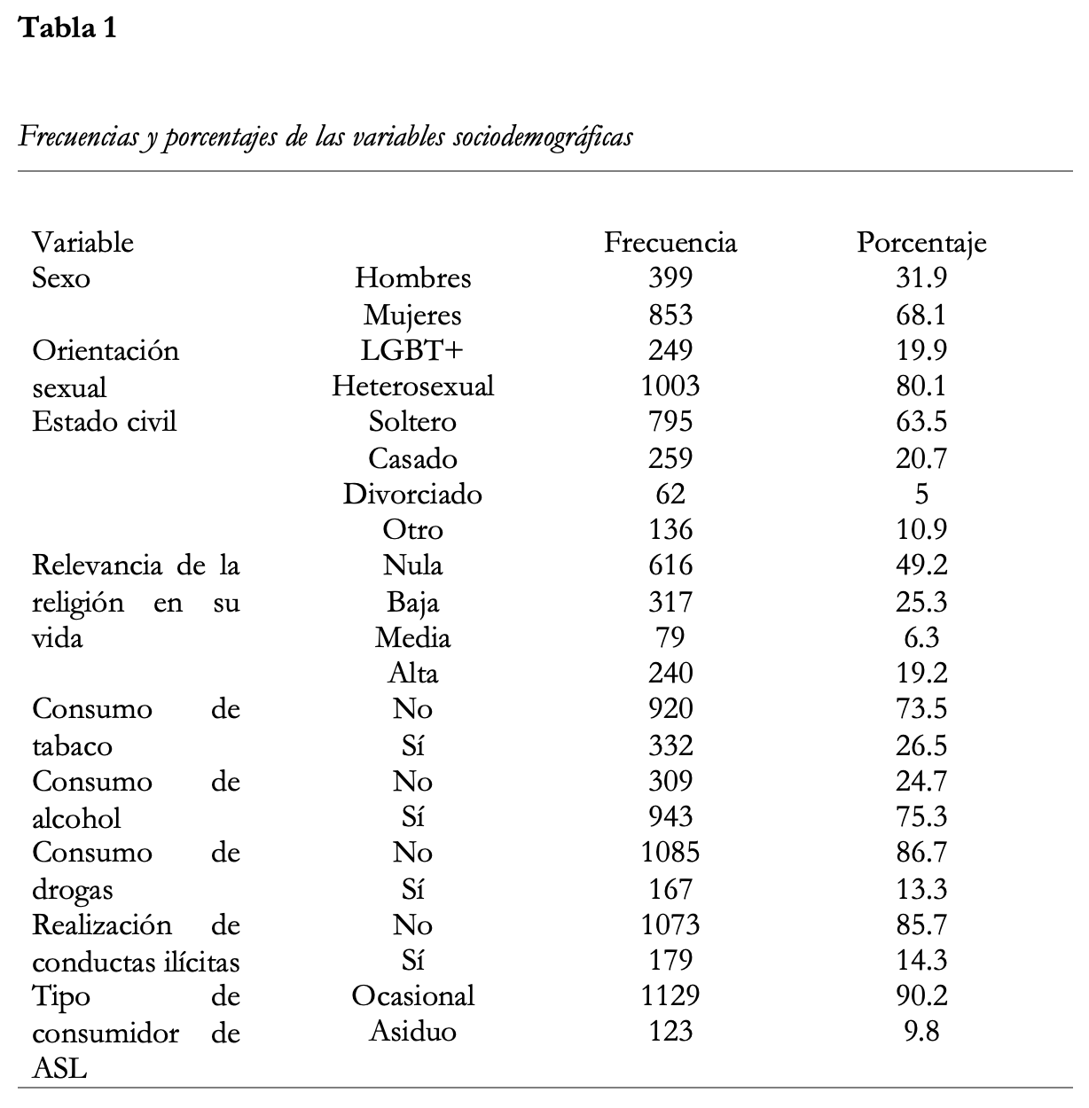 La muestra total estuvo conformada por 1252 personas, toda vez que el programa G*Power versión 3.1.9.2 arrojó que para tener un tamaño del efecto de 0.01 con una p=0.05 y un poder estadístico de 0.95 se requería de una población de 1200 participantes (mínimo); todos eran de origen mexicano, con una edad promedio general de 30.3, con una desviación estándar de 8.8; de ellos, 853 (68.1 %) fueron mujeres de entre 18 y 62 años de edad, media de 30.11 y desviación de 8; y 399 (31.9 %) fueron hombres de entre 18 y 69 años, con una edad media de 30.78 y desviación de 9.1. Los criterios de inclusión fueron: ser mayor de 18 años, de nacionalidad mexicana y haber firmado el consentimiento informado; los criterios de exclusión y eliminación establecidos fueron que no se respondieran los instrumentos en su totalidad y que el participante declarara no haber realizado alguna ASL en los últimos 12 meses. La distribución geográfica de la muestra estuvo compuesta de la siguiente manera: 41 % de los participantes pertenecientes a la Ciudad de México, seguido de un 28 % de personas del Estado de México, y el resto de la muestra, que representó el 31 %, reside en Guanajuato, Morelos, Veracruz, Tlaxcala, Nuevo León, Hidalgo y Jalisco. En la Tabla 1 se muestran con mayor detalle las variables sociodemográficas medidas.