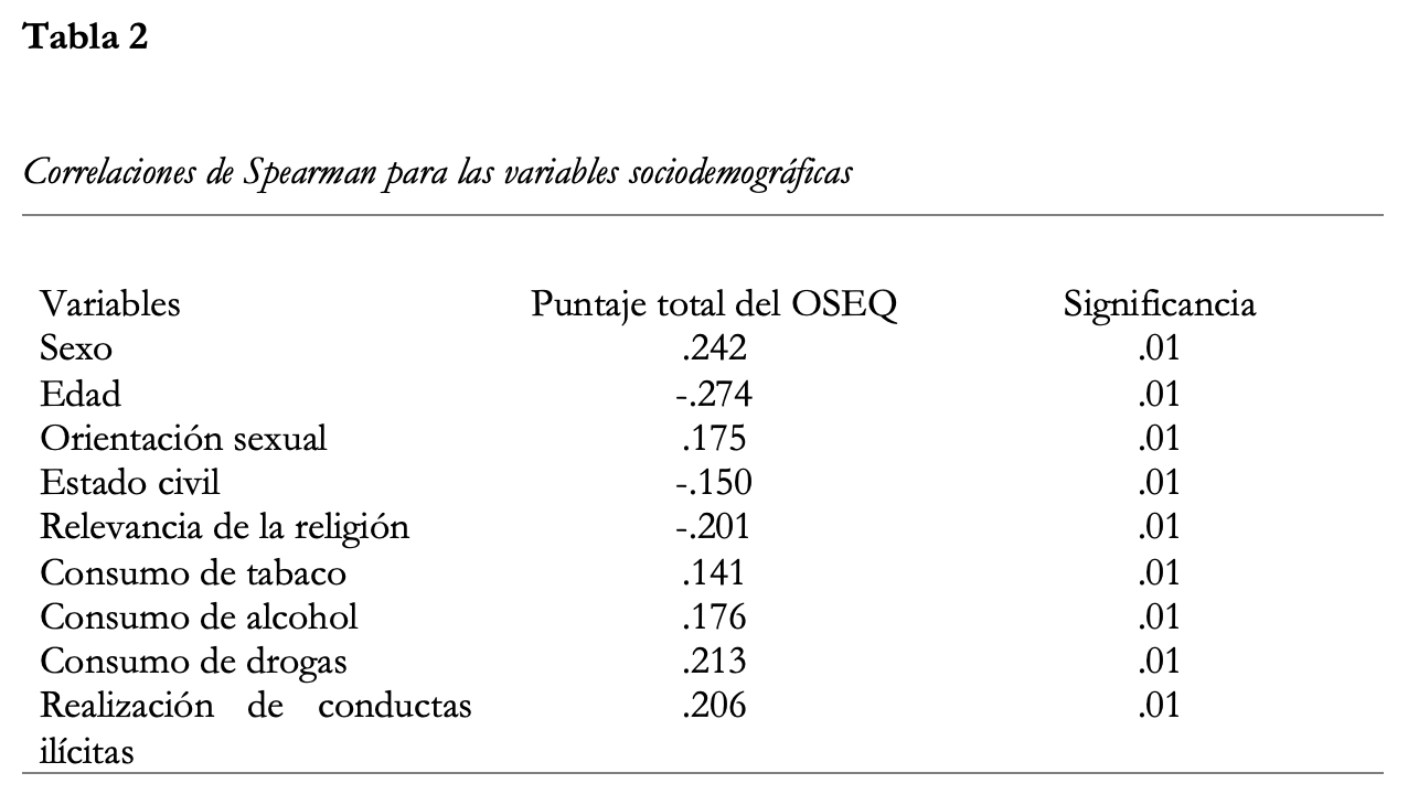 Se realizaron correlaciones bivariadas tanto de Pearson como de Spearman para conocer el grado de relación existente entre las múltiples variables sociodemográficas, los factores de las variables psicológicas medidas y los puntajes brutos del Cuestionario de experiencia sexual en línea, distinguiendo dos tipos de consumidores (ocasional/asiduo). En la Tabla 2 se muestran los puntajes de las variables resultantes significativas al .05, eliminándose variables como máximo nivel escolar o nivel de ingreso mensual entre las variables sociodemográficas medidas. En las Tablas 3 y 4 se presentan las correlaciones significativas de las variables psicológicas relacionadas con la desregulación emocional y el distrés psicológico.