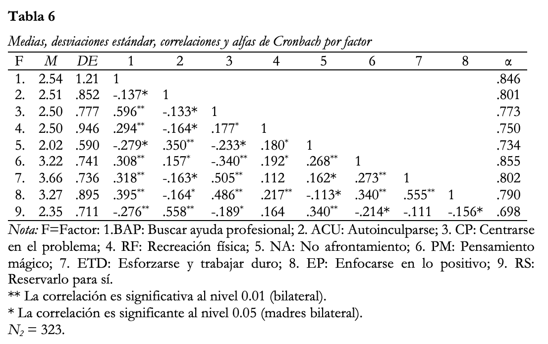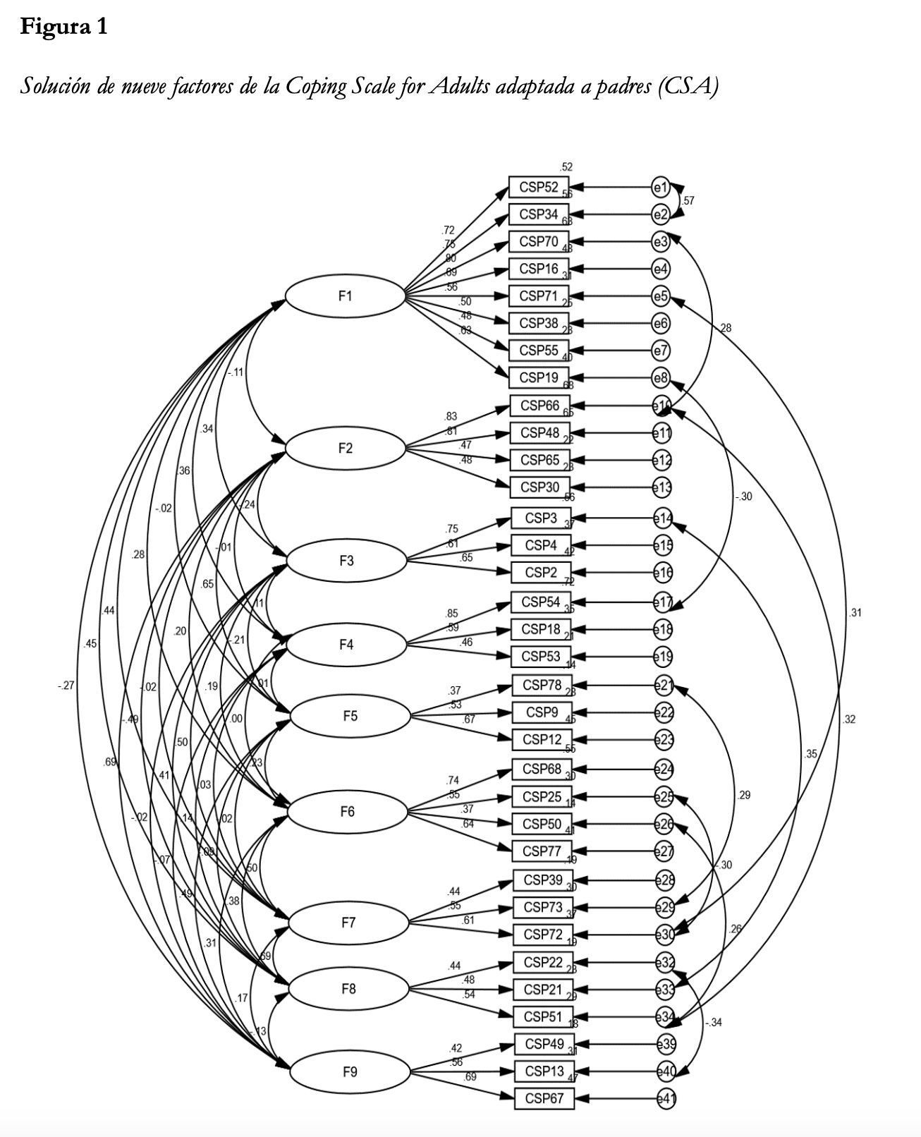 Las covarianzas entre los factores oscilaron entre .20 y .69, excepto entre el Factor 1 BAP y el Factor 2 ACU (-.11). Para el Factor 1 BAP (Buscar ayuda profesional), las cargas factoriales (λ) oscilaron de .37 a .80; para Factor 2 ACU (Autoinculparse) fueron de .47 a .83; para el Factor 3 CP (Centrarse en el problema) fueron de .61 a .75; para el Factor 4 RF (Recreación física), las cargas fueron de .46 a .85; para el Factor 5 NA (No afrontamiento) fueron de .37 a .67; para el Factor 6 PM (Pensamiento mágico) fueron de .37 a .74, en el Factor 7 ETD (Esforzarse y trabajar duro), variaron de .44 a .61; para el Factor 8 EP (Enfocarse en lo positivo) se observaron cargas de .44 a .54 y para el Factor 9 RS (Reservarlo para sí) de .42 a .69.