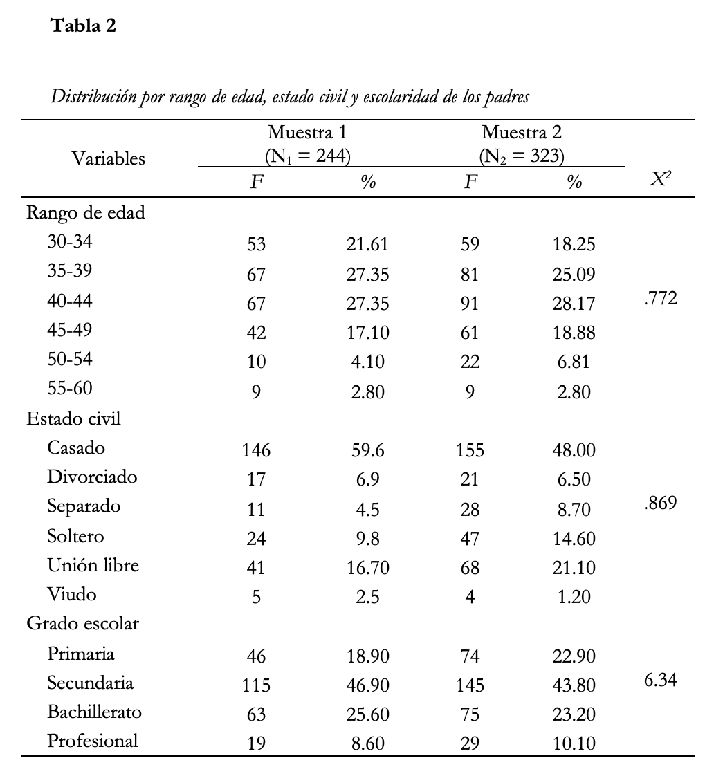 Las muestras (M1 y M2) estuvieron constituidas por madres y padres que presentaron una distribución similar en cuanto a edad, estado civil y grado de escolaridad (Tabla 2). Con referencia a la edad, en ambas muestras el rango osciló entre 30 y 60 años (M1edad = 39.92, DE = 2.28; M2edad = 40.79, DE = 3.73). Se observa que aproximadamente la mitad de las madres/padres de las dos muestras están casados, cuentan con un nivel escolar de secundaria y alrededor de la cuarta parte tienen estudios equivalentes al bachillerato; un menor porcentaje de madres/padres tienen un nivel escolar de únicamente primaria y aún inferior es el correspondiente al nivel profesional.
