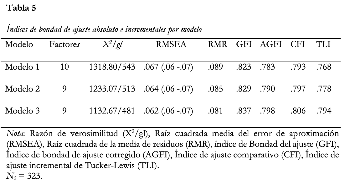 Con base en el análisis factorial previo, con una segunda muestra (N2 = 323) se realizó el AFC estimando la normalidad multivariante (1.89, 1.32 [±1.96; IC 96 %]) y por medio del método de máxima verosimilitud (ML). Se sometieron a prueba varios modelos a través de diversas reespecificaciones. En la Tabla 5 se muestran los índices de ajuste de los modelos. El Modelo 1 es el resultado inicial, en el cual se conservaron los diez factores con los 40 ítems del análisis factorial previo por CP. Al hacer la reespecificación de acuerdo con los índices de modificación el resultado fue el Modelo 2, que excluyó tres ítems: 27. Intentar sentirme mejor bebiendo alcohol, fumando o con drogas, 35. Salir y divertirme para olvidar mis problemas y 40. Preocuparme por lo que está pasando, debido a que el peso de regresión con respecto a estos puntos no fue significativo, por lo que se conservaron solo dos ítems en el Factor 9 (Reducción de la Tensión); como parte de la reespecificación de este modelo se excluyeron dos elementos más: 5. Reunirme con amigo/as y 36. Mantenerme en forma con buena salud, por presentar correlaciones con varios reactivos de otros factores (r = .824; r = .789). Finalmente, el ítem 11. Ignorar el problema, ubicado en el Factor 9 inicial, se eliminó, quedando una tercera configuración (Modelo 3) con mejores indicadores de ajuste que muestra una solución de nueve factores; sin embargo, el AGFI no presenta los valores óptimos esperados, por lo que se considera aceptable o marginal.