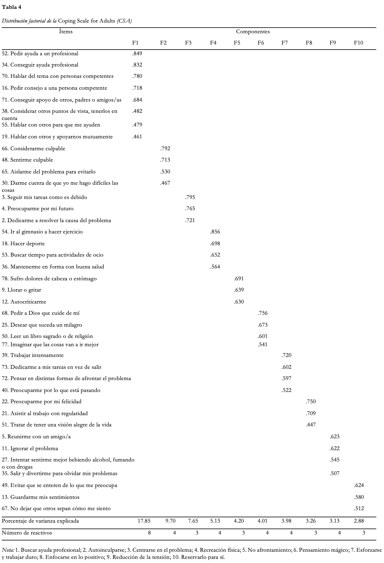 A partir del ACP se retuvieron 10 factores de los 19 propuestos en el CSA original (Frydenberg & Lewis, 2000b; 2002a), que explicaron el 63.58 %, con índices de consistencia interna total (.857) y por factores (.698 a .855) aceptables (Nunnally & Bernstein, 1995), similares a los reportados previamente (.690 a .920), con el valor más bajo en el último factor (RS). Aunque con una agrupación y peso diferente, se conservaron factores que la literatura menciona reiteradamente como estrategias básicas productivas (BAP, RF, ETD, EP y RF) y no productivas (ACU, NA, PM y RS), frecuentemente usadas por diversas poblaciones (Frydenberg, 2017; Lewis et al., 2011; Romi et al., 2013) y reportadas en algunos estudios con muestras mexicanas con otros instrumentos, como el WCQ (p. ej., Nava, Vega et al., 2010; Zavala, 2008), el SACS (p. ej., Villegas & Lucio, 2007), o el CSI (p. ej., Nava, Ollua et al., 2010). También se encontraron datos similares, en cuanto a confiabilidad y validez, por ejemplo, al del COPE (Cabral & Matos, 2010; Carver et al., 1989), el WCQ (Nava, Vega et al., 2010), y al SACS (Villegas & Lucio, 2007), con alfas que en promedio oscilaban entre .60 y 85 y varianzas incluso muy bajas (p. ej., 27 %, 35 %, 36 % y 62 %).
