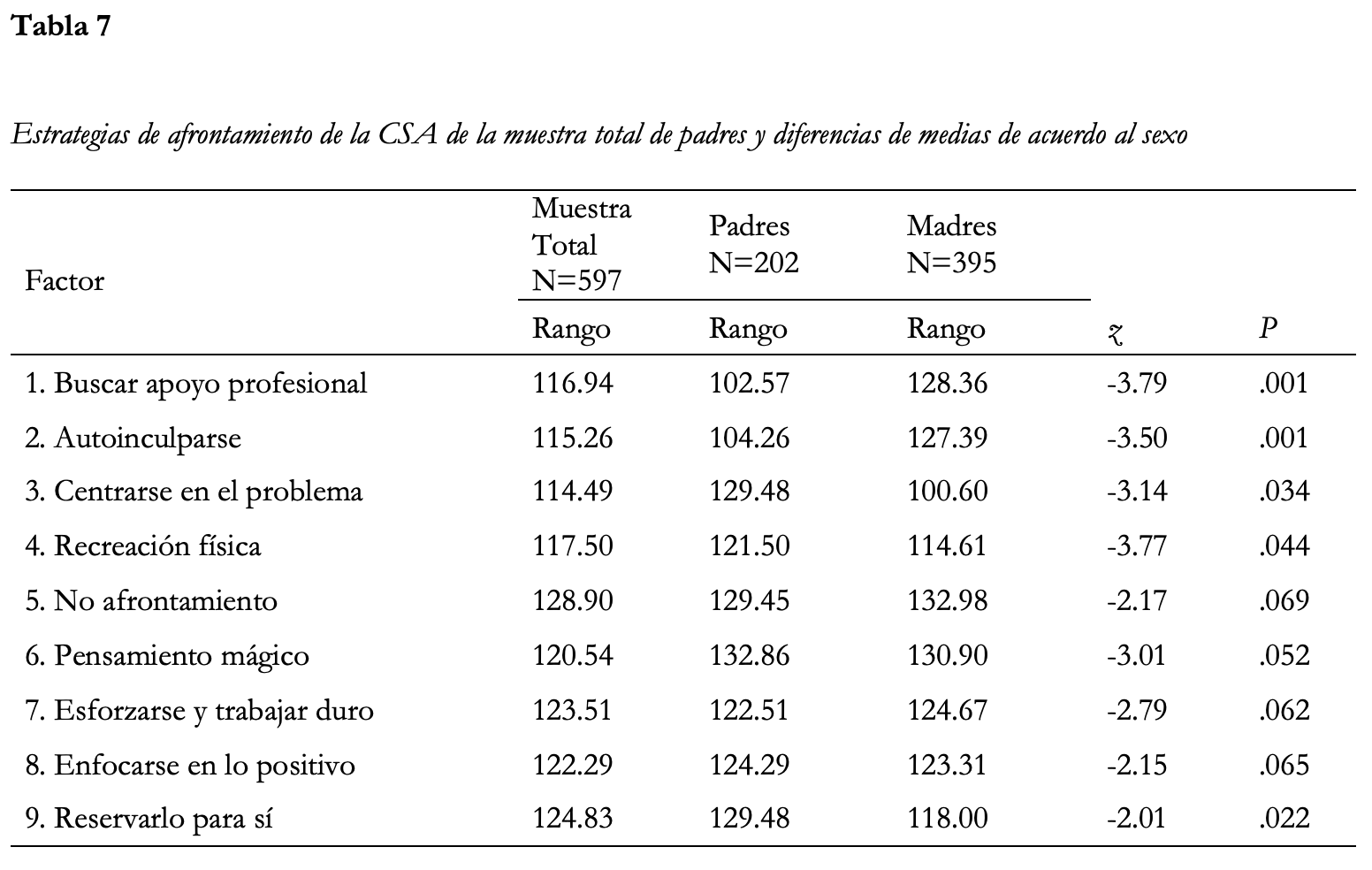 En cuanto a las diferencias entre progenitores, en la Tabla 7 se observan diferencias estadísticamente significativas entre las madres y padres (U-Mann-Whitney) en Centrarse en el problema, Recreación física y Reservarlo, con valores más altos en los padres, mientras que en Búsqueda de apoyo profesional y Autoinculparse las madres presentan puntuaciones mayores que los hombres. En el resto de los factores no se encontraron diferencias.