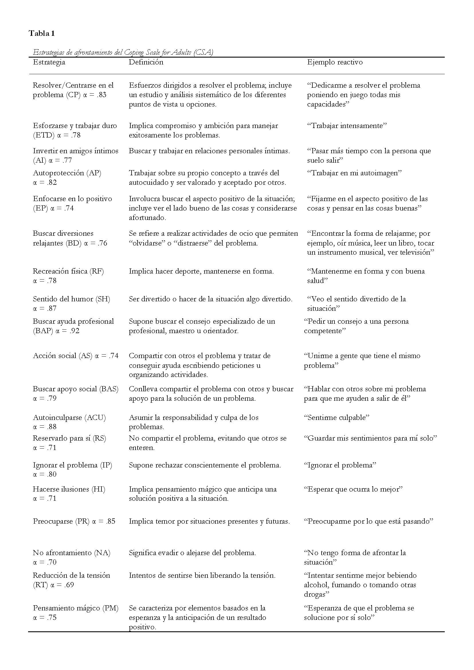 Se utilizó la versión original larga de la Coping Scale for Adults (CSA: Frydenberg & Lewis, 2000b, 2002a), compuesta de 74 ítems tipo Likert de 5 puntos: 1. No me ocurre/nunca lo hago; 2. Me ocurre/raras veces lo hago; 3. Me ocurre/algunas veces lo hago; 4. Me ocurre/ frecuentemente lo hago, 5. Me ocurre/muy frecuentemente lo hago, integrados en 19 estrategias de afrontamiento (alfas de Cronbach de .69 a .92), descritas en el apartado anterior. Presenta una forma general que evalúa estrategias de afrontamiento que una persona usa regularmente, que son en gran parte estables, con independencia del origen del problema, ante diversas situaciones.