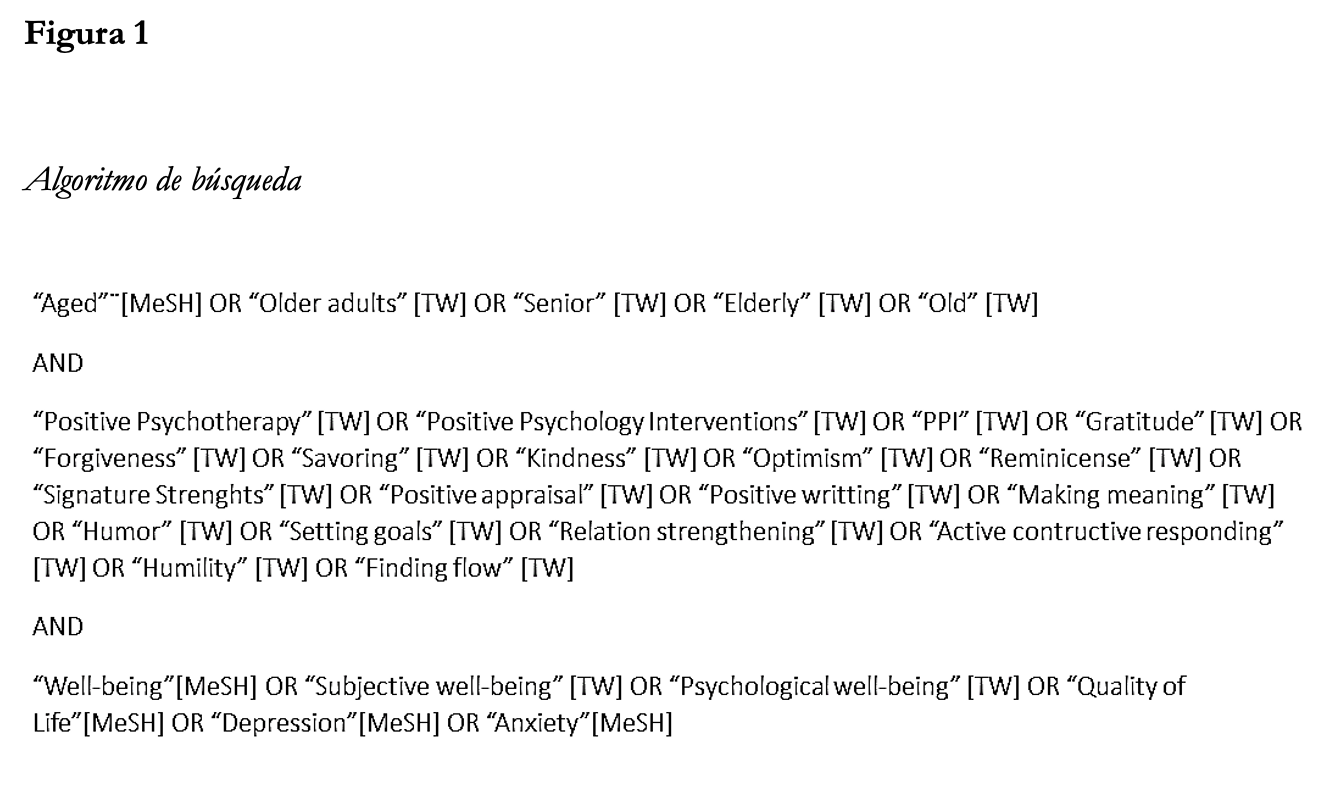 Se realizó una revisión sistemática de agosto a octubre de 2020 para identificar artículos que utilizaron IPP como intervenciones en adultos mayores. Se emplearon las guías PRISMA (Moher et al., 2009) para planear e implementar la revisión e identificación de estudios relevantes en bases electrónicas de búsqueda. Se utilizó una combinación de términos MeSH (Medline Subject Headline, vocabulario controlado que emplean las bases de datos y que conjunta vocablos sinónimos), palabras claves apropiadas obtenidas en tesauros y se incluyeron términos generales sobre las IPP tanto en el idioma inglés como su traducción al español, expresiones específicas sobre los diferentes tipos de IPP, voces relacionadas con la población de interés y términos ligados a las variables de importancia. Se utilizaron descriptores booleanos, AND para unir los términos principales de la búsqueda (población, intervención y variables) y OR para enlazar las palabras sinónimas e intercambiables dentro de cada término principal, y se registraron las combinaciones realizadas en cada base de datos. En la Figura 1 se muestra el algoritmo general empleado en el que aparecen todos los términos usados y con los cuales se puede replicar la búsqueda.
