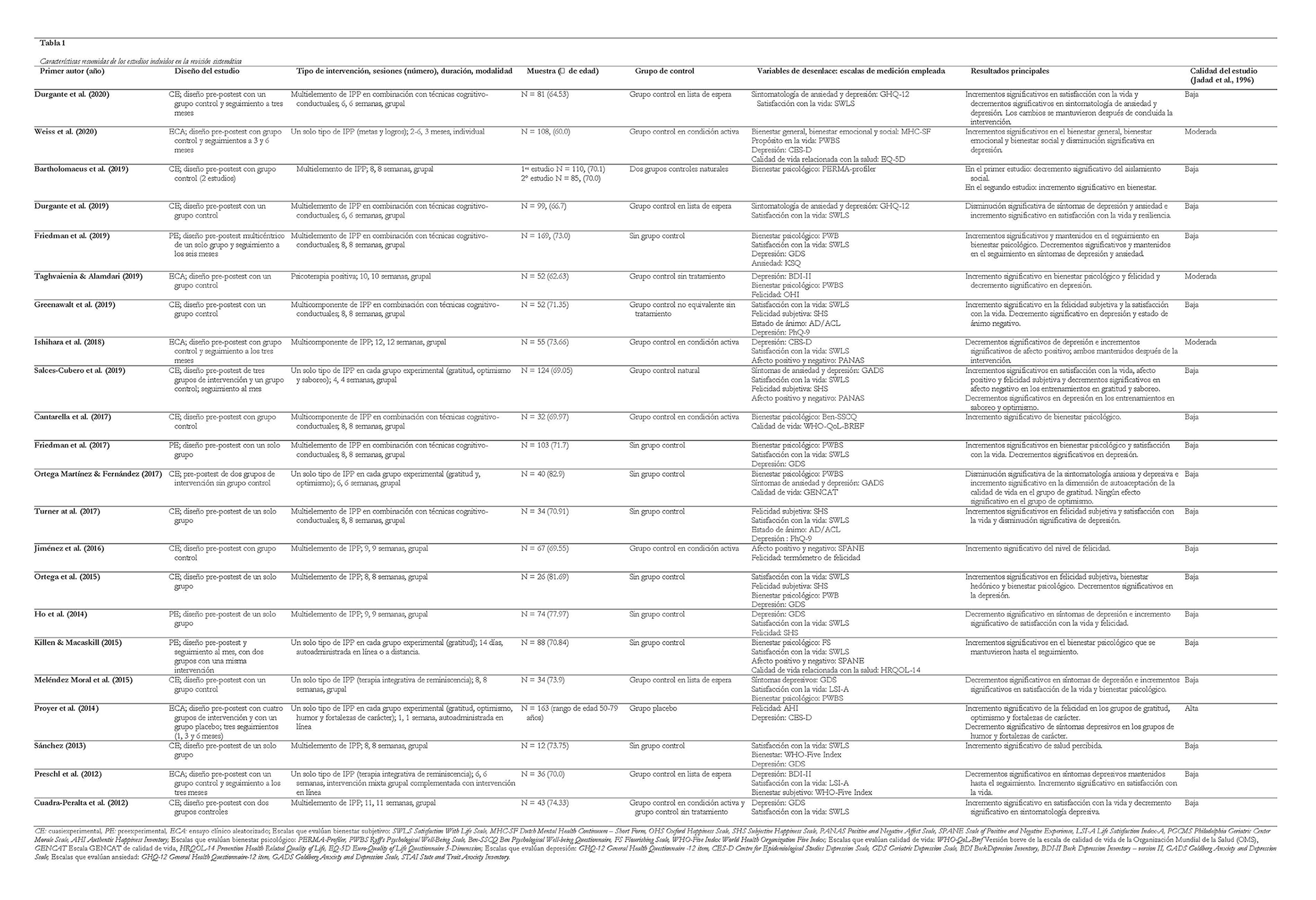 Los participantes de los estudios seleccionados podían ser hombres o mujeres y la media de edad de la población incluida en el estudio debía ser de sesenta o más años de edad. Las intervenciones empleadas debían ser congruentes con las vías propuestas por la teoría de la psicología positiva para fomentar el bienestar. No se tomó en cuenta el perfil profesional de las personas que implementaron las intervenciones, el escenario o la modalidad de intervención (individual, grupal o en línea) para limitar la inclusión de los estudios.