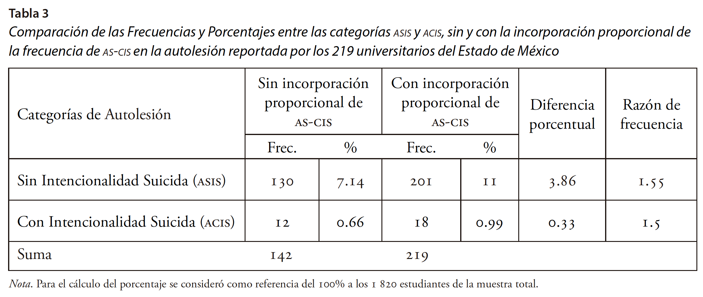 Con el propósito de obtener datos plausibles de comparación del reporte de autolesión, cuando se reporta Autolesión sin la categoría AS-CIS, en la Tabla 3 se presenta la comparación de frecuencias y porcentajes de la presencia de ASIS y ACIS con integración en cada una de la proporción correspondiente de casos registrados como AS-CIS: ASIS, con 92 % de casos de AS-CIS; ACIS, con 8 % de casos de AS-CIS. Se observa incremento importante en ASIS, de 7.14 % a 11 %, y menor incremento en ACIS, de 0.66 % a 0.99 %.