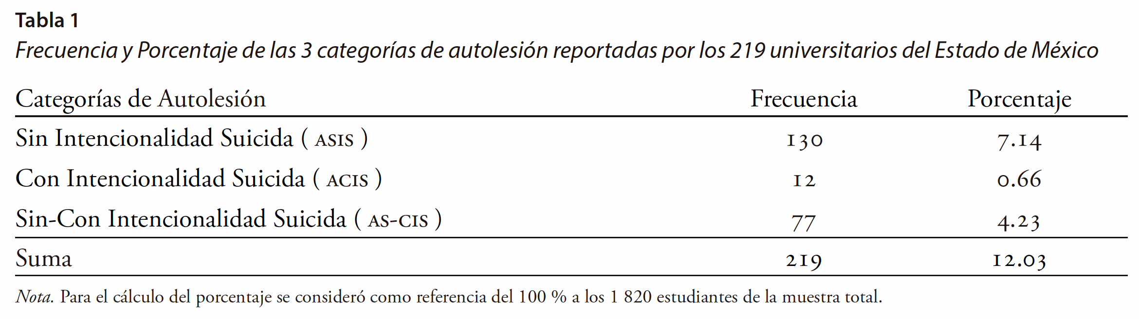 En estudiantes universitarios mexicanos, Rosales Pérez et al. (2019) informan que en la revisión de diez estudios con reporte de haber registrado ACIS, se percataron de que sólo tres de ellos notifican la pregunta que emplearon para el registro: "¿Alguna vez, a propósito, te has herido, intoxicado o hecho daño con el fin de quitarte la vida?" (Domínguez Mercado et al., 2016; Terrones-González et al., 2012) y "Traté de quitarme la vida (lastimándome, haciéndome daño, cortándome, tomando pastillas, asfixiándome, envenenándome, con el propósito de morir)" (Padilla Gámes et al., 2018). Sólo una investigación notificó del porcentaje de ACIS que se registró en la muestra de estudiantes universitarios de la ciudad de Durango: 7.42 % (Terrones-González et al., 2012), por lo que Rosales Pérez et al. (2019) señalan la imposibilidad de comparar resultados del registro de ACIS en estudiantes universitarios mexicanos, dada la fata de información respecto al contenido del autoinforme aplicado para el levantamiento de información, de señalamiento respecto a la presencia de ACIS (ya sea a través de la frecuencia o del porcentaje) y de claridad en los objetivos de estudio en relación con ACIS. Es desde esta perspectiva que se subraya la necesidad de realizar investigación orientada a esta conducta, especificando el formato de autoinforme usado para el registro, así como el objetivo de su registro y los resultados encontrados en porcentaje o frecuencia en estudiantes universitarios mexicanos.