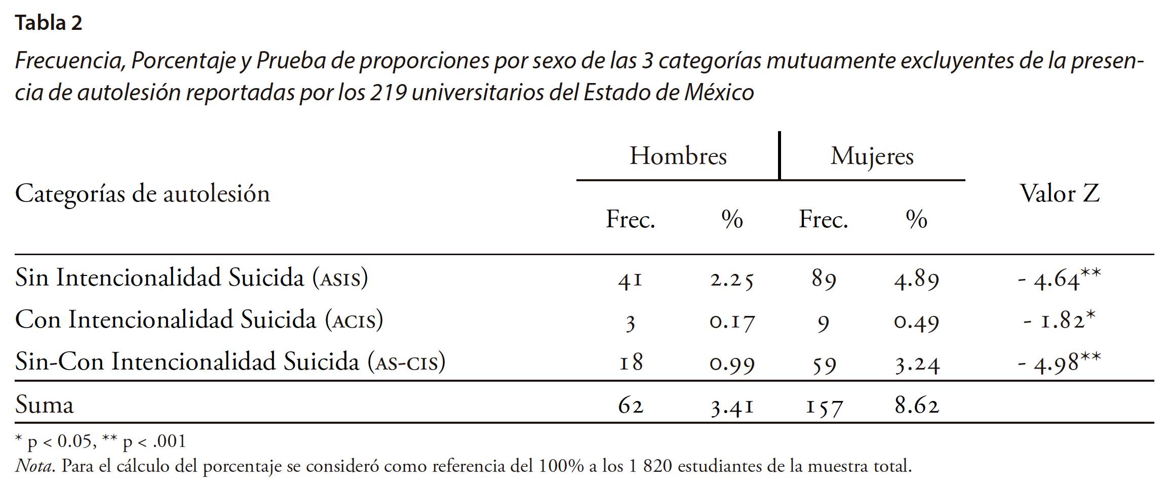 La identificación de la presencia de las distintas categorías de Autolesión y su comparación por sexo en universitarios se realizó con los siguientes procedimientos estadísticos: 1) Distribución de frecuencias y porcentajes en muestra total del reporte de presencia general de Autolesión y específica de ASIS, ACIS y AS-CIS, por sexo; 2) Prueba Chi cuadrada, p ≤ 0.05para comparación de la presencia general de Autolesión por sexo; 3) Prueba de diferencias de Proporciones . con p ≤ 0.05, para comprobación de la diferencia entre hombres y mujeres en las categorías de ASIS, ACIS y AS-CIS.
