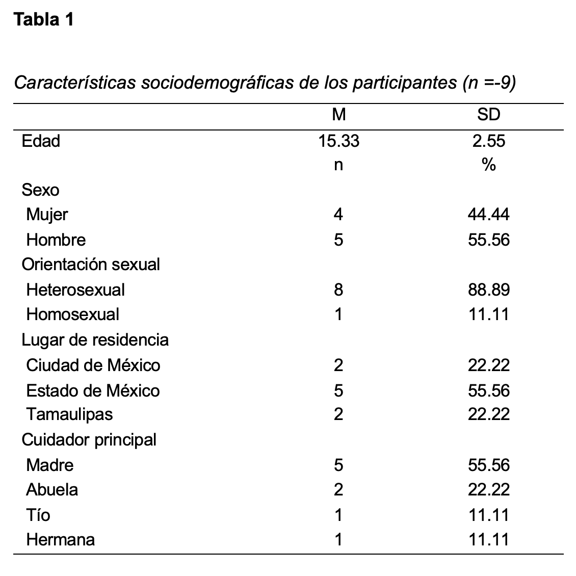La intervención se realizó con nueve adolescentes de 12 a 19 años (M = 15.33; D.E = 2.55), de los cuales cinco eran hombres y cuatro mujeres; la mayoría eran residentes del Estado de México y los cuidadores principales más frecuentes fueron las madres (ver Tabla 1). En la fase de seguimiento se contó con seis de los nueve participantes que recibieron la intervención. Se incluyeron adolescentes pacientes de la clínica de VIH de un hospital pediátrico de tercer nivel que da atención pública en la Ciudad de México. Se consideraron únicamente aquellos adolescentes que conocían su diagnóstico de VIH. La población total con estas características era de doce pacientes. Al establecer contacto con ellos, tres pacientes mencionaron que ya no asistían a dicha institución o que no tenían programadas citas en los próximos meses.