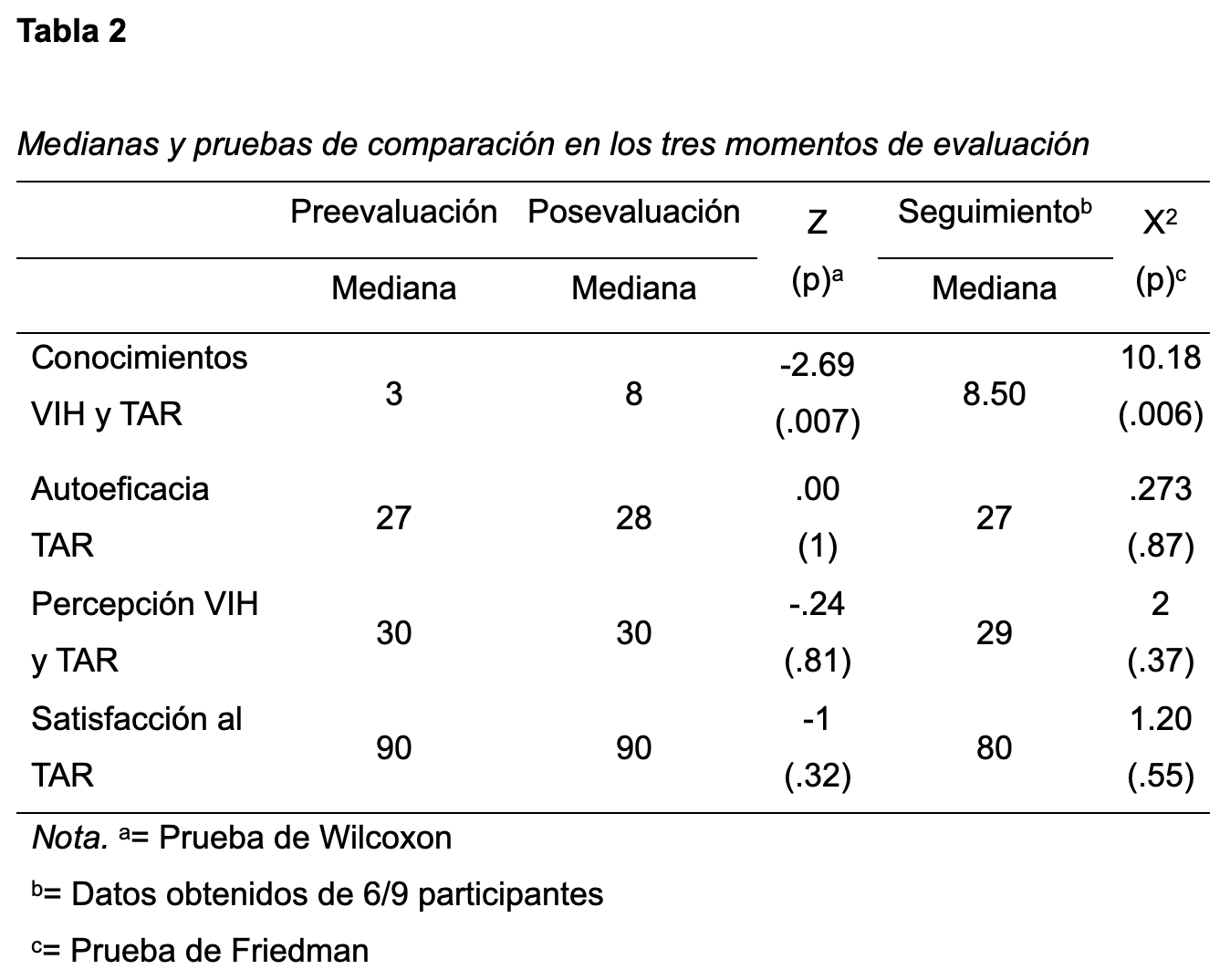 Respecto a la comparación de medianas, como se observa en la Tabla 2, en cuanto a los conocimientos sobre VIH y TAR en la preevaluación y la posevaluación se obtuvo una diferencia significativa (Z= -2.59; p= .007), así como en la comparación de los tres momentos de evaluación (X.= 10.18; p = .006), en la cual se observan 8.5 aciertos en el seguimiento a un mes. Al comparar reactivo por reactivo del instrumento de conocimientos sobre VIH y TAR, se encontró que el reactivo sobre la indetectabilidad, ¿Qué es estar indetectable?, mostró una diferencia significativa. Por otra parte, no se presentaron cambios significativos en cuanto a la autoeficacia (Z= .00; p= 1), la percepción (Z= -.24; p= .81) y la satisfacción al TAR (Z= -1; p= .32). De igual forma, al realizar la comparación entre los tres momentos de medida tampoco se encontraron cambios significativos entre autoeficacia (X.= .273; p= .87), percepción (X.= 2; p= .37) y satisfacción (X.= 1.20; p= .55).