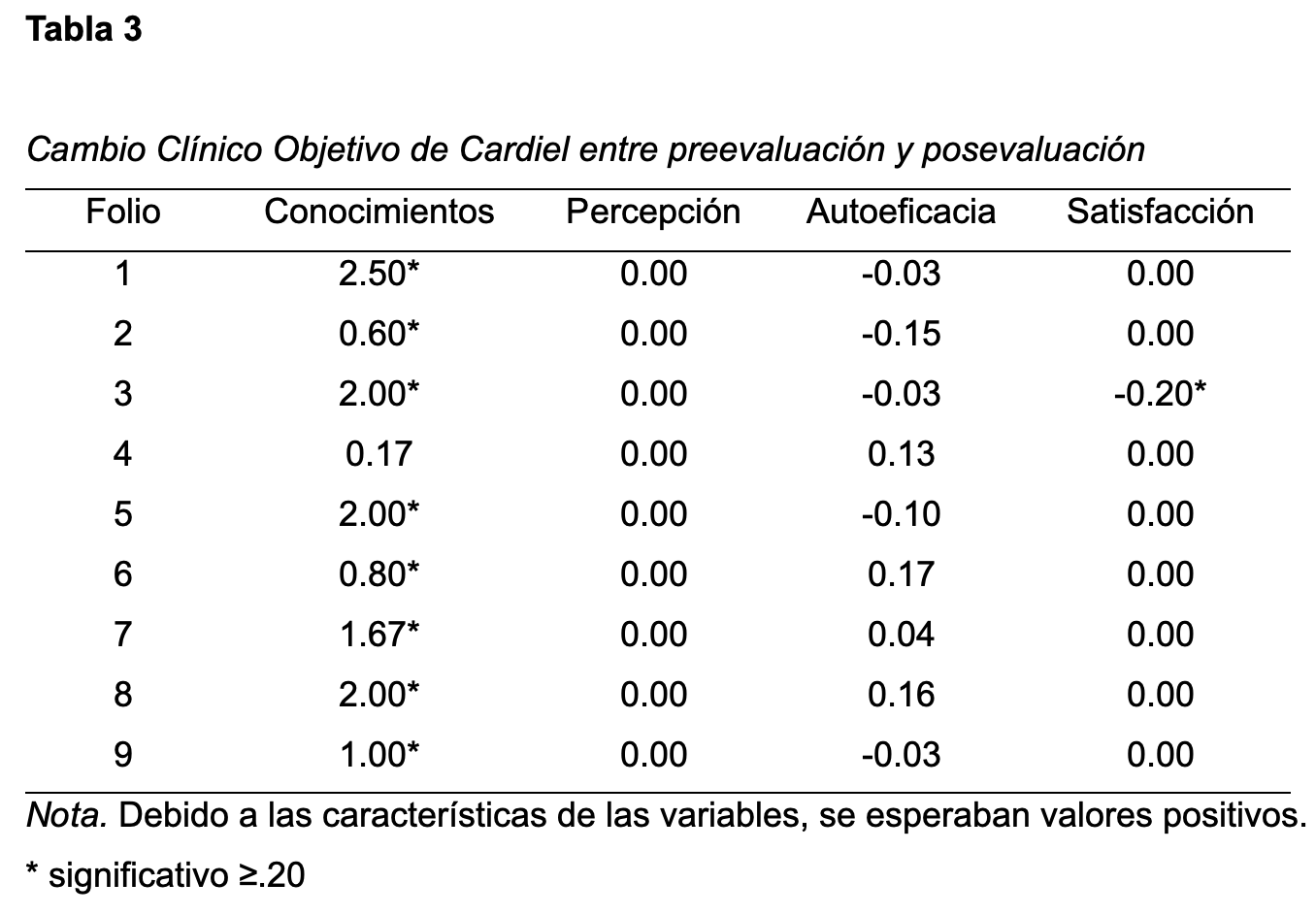 Respecto al Cambio Clínico Objetivo de Cardiel (Tabla 3), se obtuvieron cambios clínicamente significativos en los conocimientos entre el pre y el post en ocho de los nueve participantes, mientras que en satisfacción se obtuvo un valor de -.20 lo que indica que, en el participante tres, se presentó un cambio significativo en dirección opuesta a la esperada.