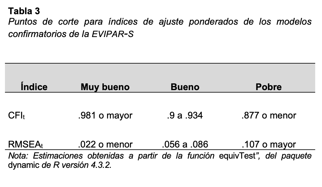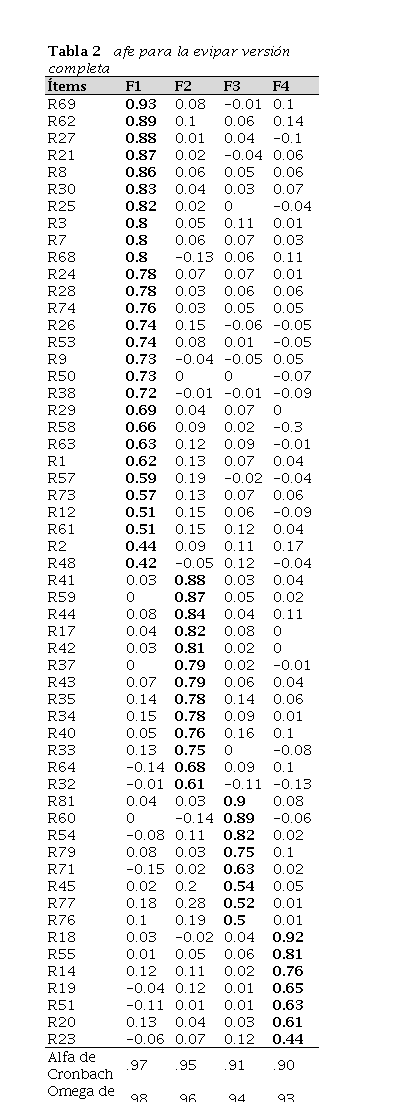 Una vez obtenida una versión completa adecuada, y con la finalidad de crear una versión con mayor facilidad de aplicación y efectividad en tiempos de evaluación, se construyó una versión corta. Para ello se aplicaron dos criterios de elección: se seleccionaron los reactivos con las cargas más altas para cada factor, y se revisó su pertinencia teórica en cuanto a relevancia y representatividad del contenido. Una vez hecho lo anterior, se tomaron los 5 primeros ítems de cada factor para constituir la versión corta de la escala EVIPAR.