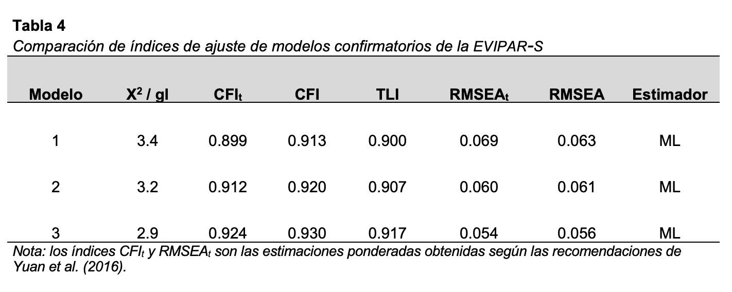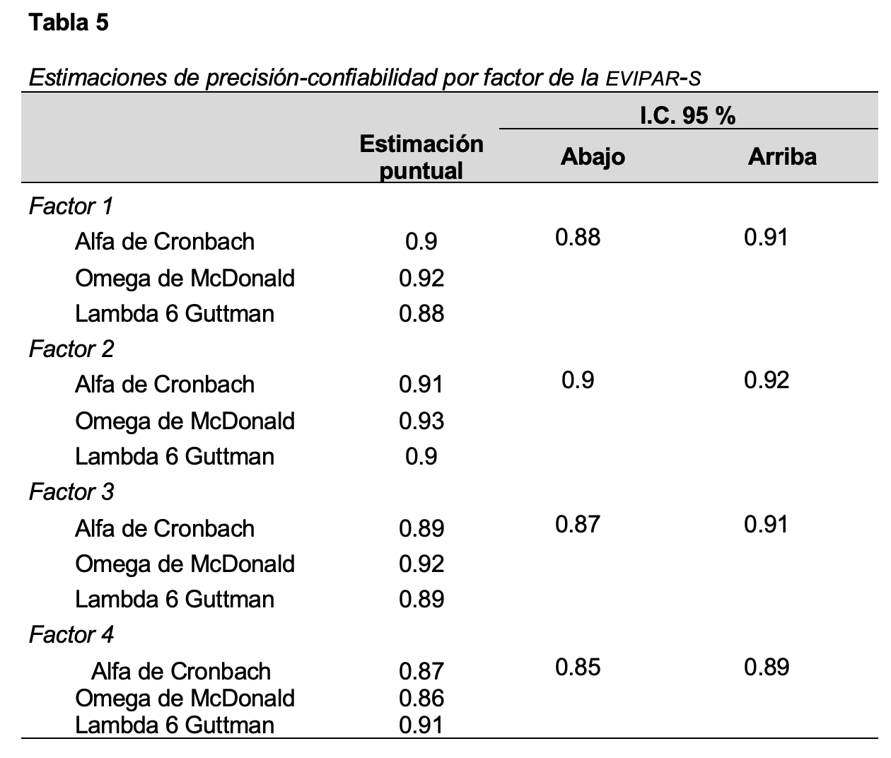A partir del tercer modelo confirmatorio de la evipar-s, se obtuvieron índices de precisión-confiabilidad: alfa de Cronbach con intervalos de confianza al 95 %, omega de McDonald y lambda 6 de Guttman para cada factor del instrumento. En todos los casos se encontraron estimaciones adecuadas de precisión entre el .86 y el .93. Los índices obtenidos se pueden observar en la Tabla 5.