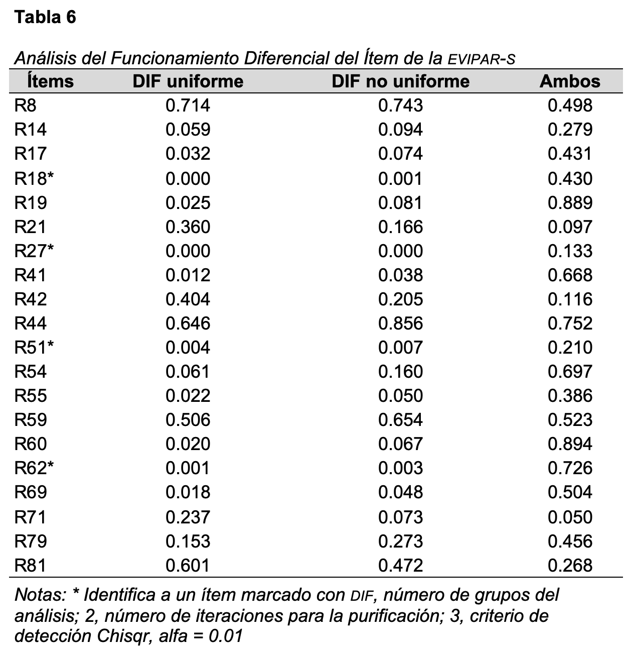 Por último, la existencia de 4 ítems con funcionamiento diferencial para hombres y mujeres motivó la modificación en la redacción de estos reactivos para buscar reducir el sesgo en las vivencias en ellos. No obstante, esta modificación no asegura la imparcialidad en la evaluación de hombres y mujeres, por lo que realizar comparaciones entre las puntuaciones de hombres y mujeres con la versión final de la EVIPAR o EVIPAR-S no es recomendable. Se requiere de una nueva aplicación y análisis dif para verificar si la modificación en la redacción fue efectiva, y si pueden realizarse comparaciones con imparcialidad.