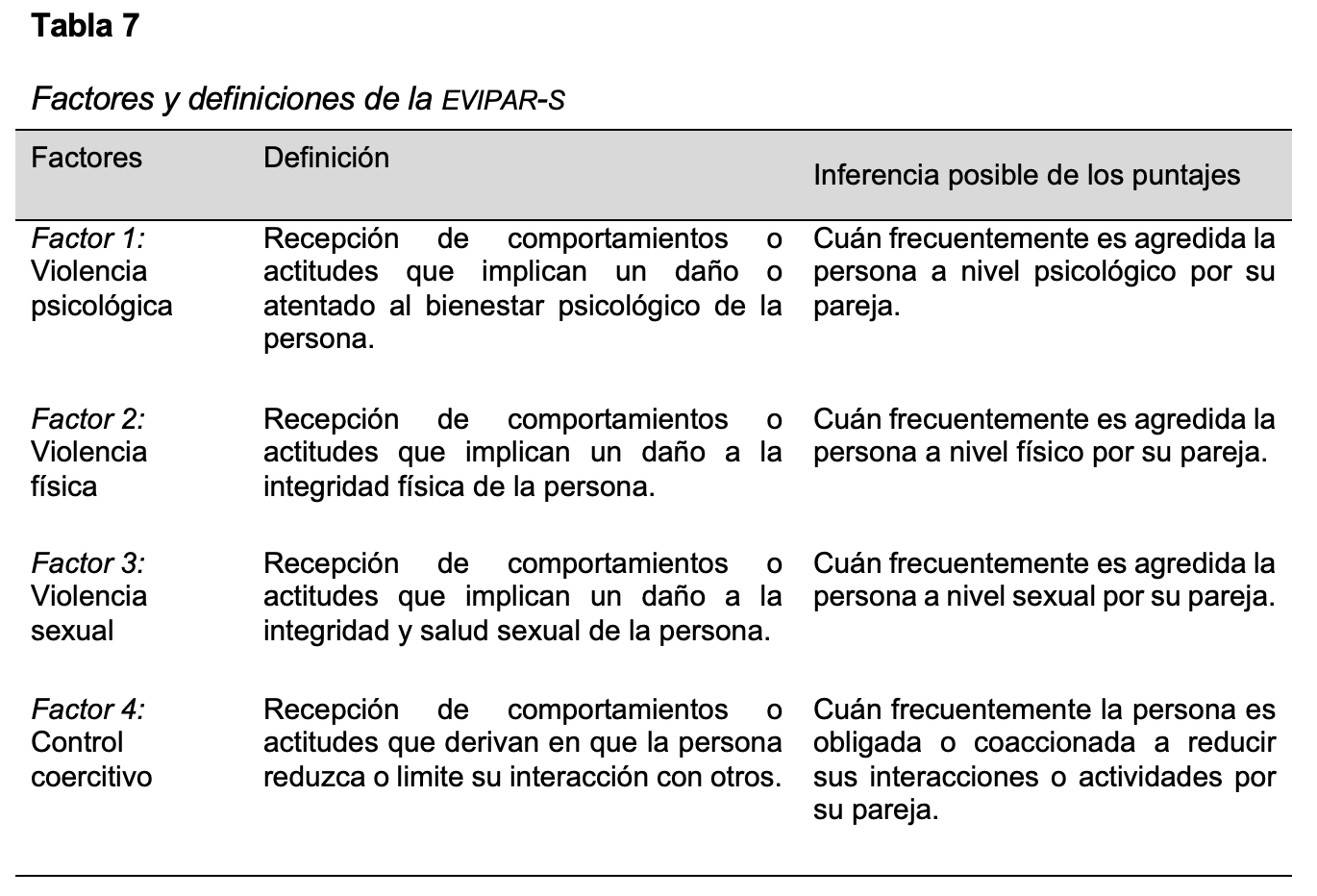 Al terminar el proceso de revisión, se establecieron los nombres, definiciones e inferencias plausibles de cada factor. Al respecto, la definición detalla los aspectos del dominio comportamental que abarca cada grupo de ítems; por otro lado, las inferencias posibles implican aquellas conclusiones a las que se puede llegar en función de un puntaje total en cada factor. Entre mayor sea el puntaje en cada factor de la EVIPAR-S, más alta será la frecuencia de la agresión. Cada definición e inferencia pueden revisarse en la Tabla 7.