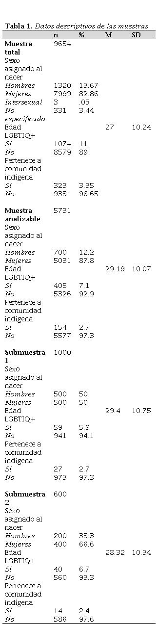 El primer momento de análisis constó de la exploración de los datos de cada una de las muestras de trabajo en búsqueda de datos perdidos, registros duplicados o errores de tipeo. Al no encontrar ningún dato conflictivo, perdido o en duplicación, se procedió con análisis descriptivos y de frecuencias de las características de los participantes: sexo asignado al nacer, edad, pertenencia a la comunidad LGBTIQ+ y pertenencia a una comunidad indígena; esta información puede observarse en la Tabla 1.