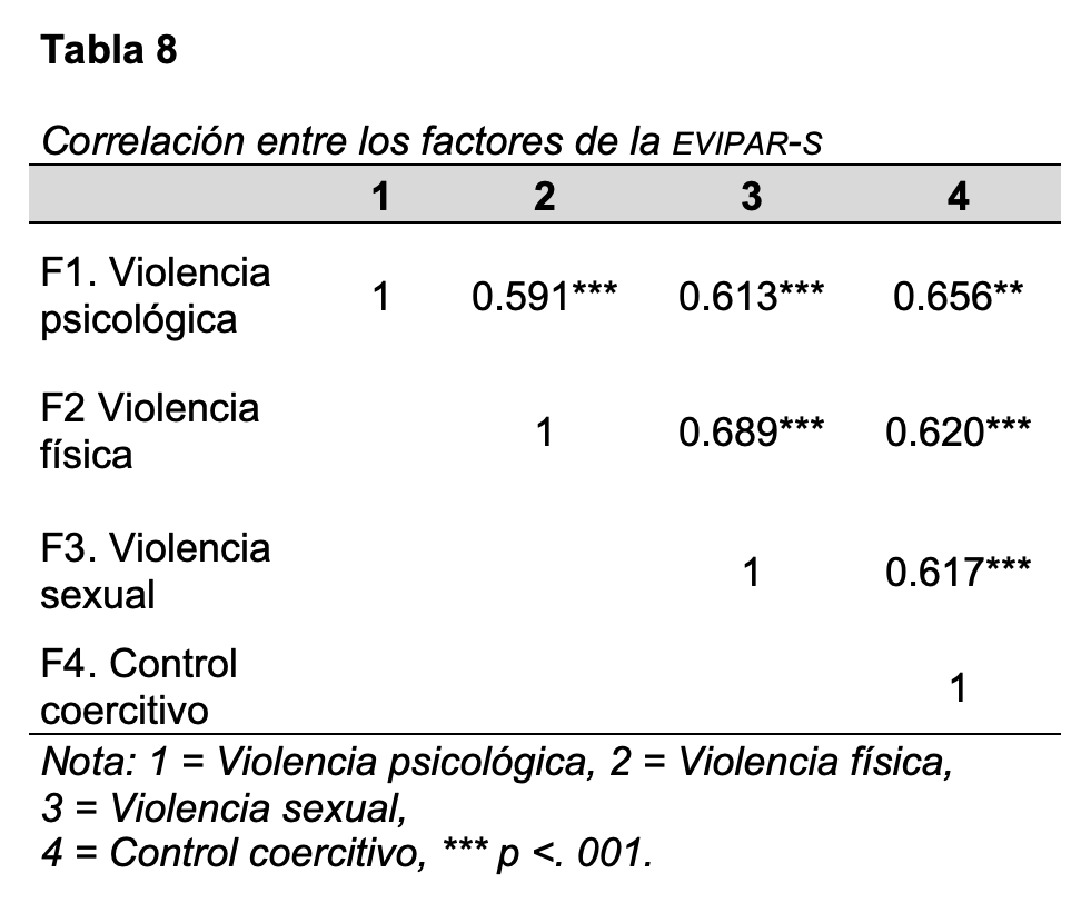 Finalmente, en la Tabla 8 se observan las correlaciones resultantes entre los factores de la escala; en ella se encontraron correlaciones significativas moderadas, con lo que se muestra la naturaleza interrelacionada de las dimensiones de la violencia de pareja.