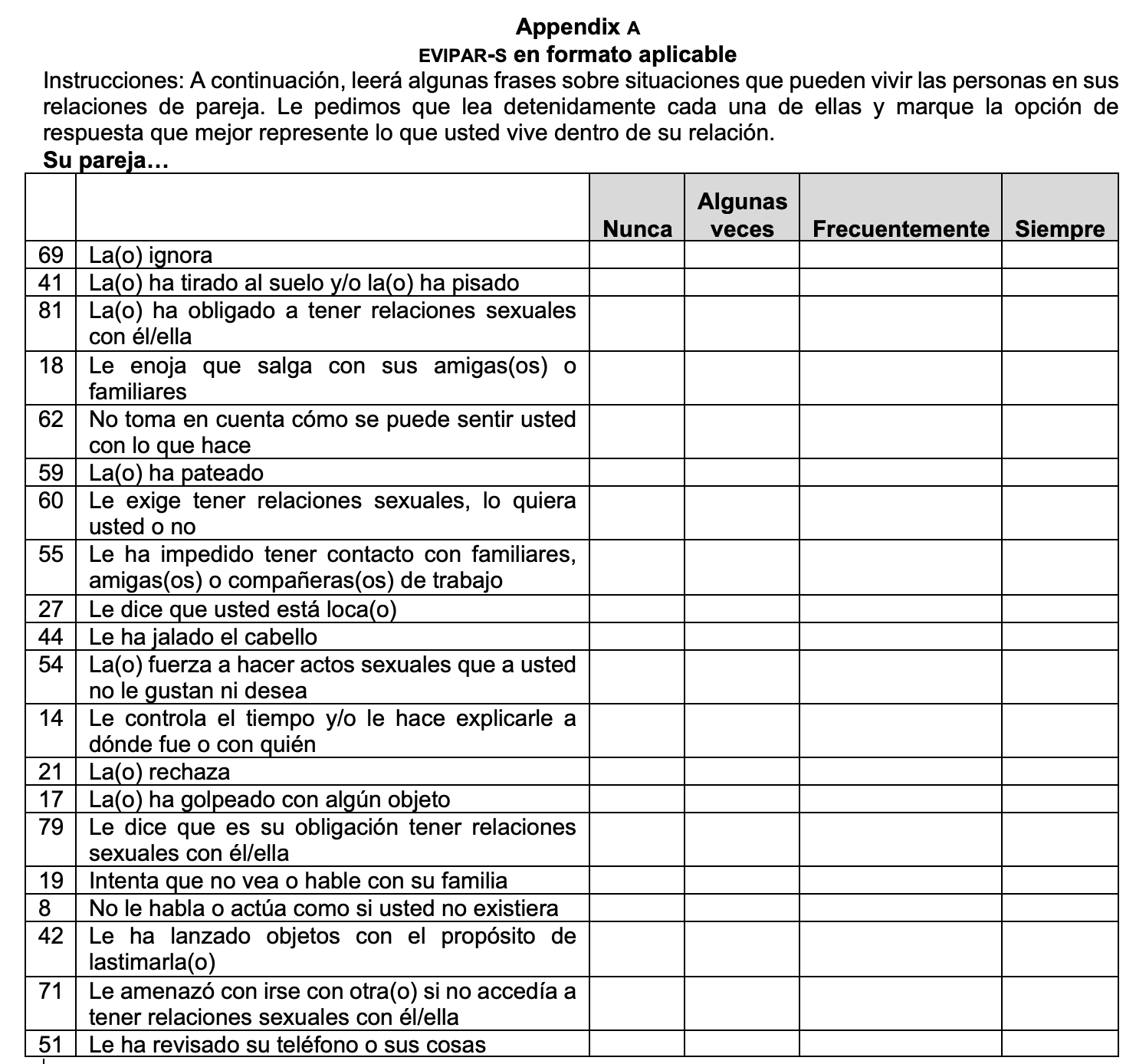 Instrucciones: A continuación, leerá algunas frases sobre situaciones que pueden vivir las personas en sus relaciones de pareja. Le pedimos que lea detenidamente cada una de ellas y marque la opción de respuesta que mejor represente lo que usted vive dentro de su relación.