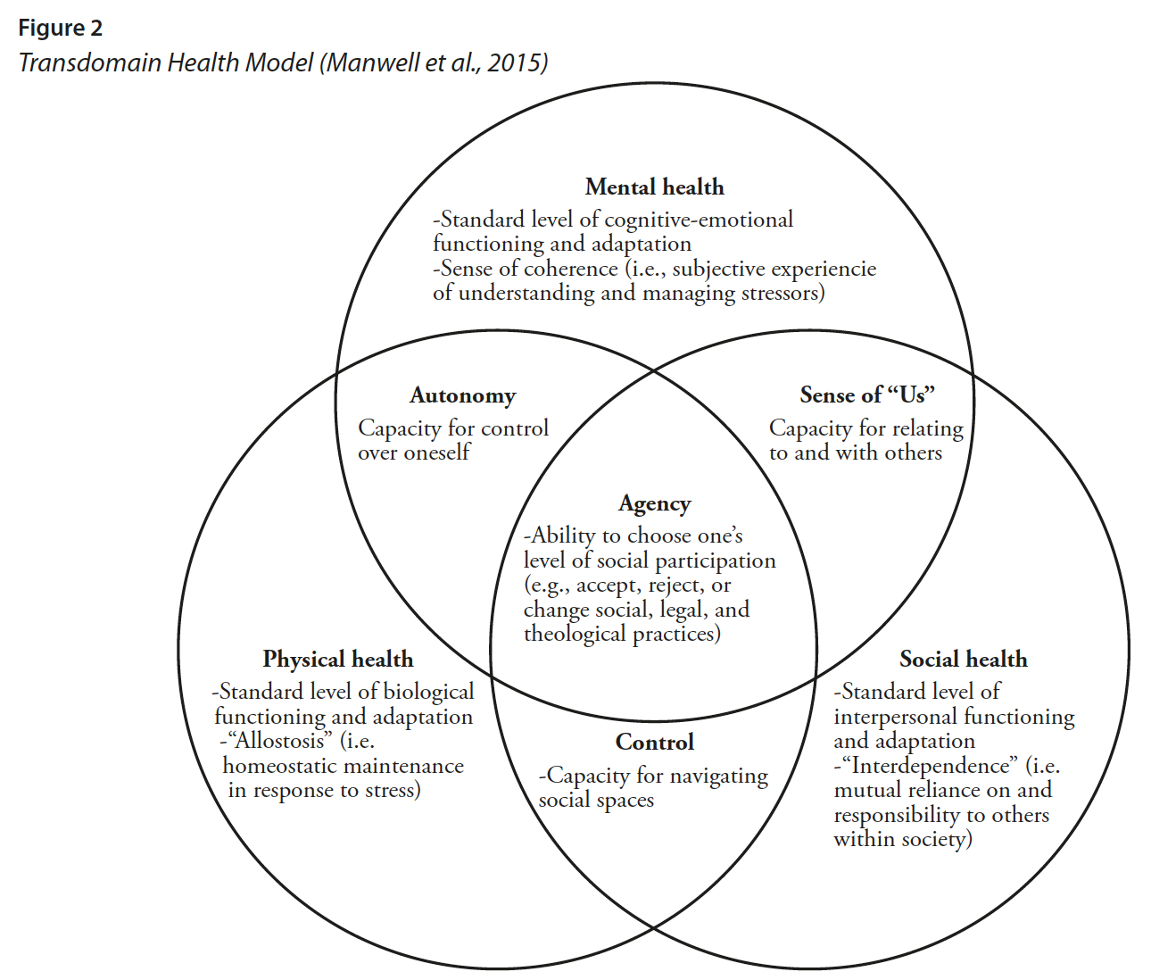 On the other hand, there is some agreement on most of the components identified as part of mental health. Based on this analysis and the incorporation of the elements indicated by WHO (2001) and Huber et al. (2011), a model was proposed with different health domains, to which relevant aspects and their interrelations in different areas of health were added (Manwell et al., 2015):