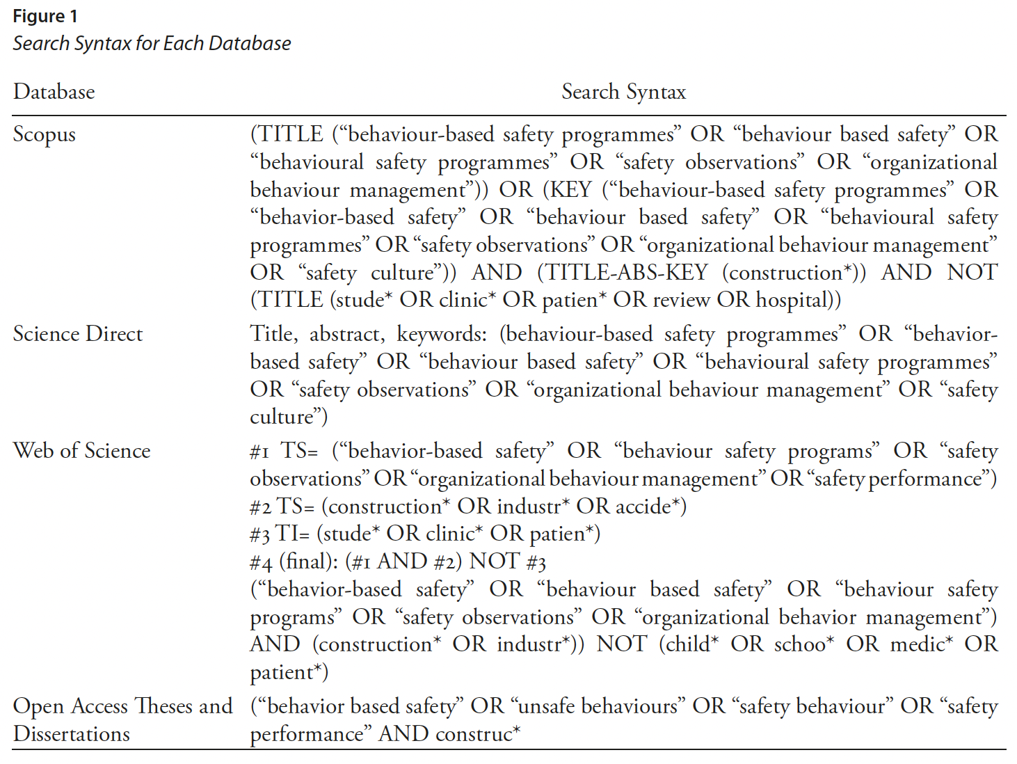 During the second stage, researchers KHM and RDM explored the databases based on content coverage, prestige and practical utility (Falagas et al., 2008). Three multidisciplinary databases (Scopus, Science Direct and Web of Science) and one specialised database (Pubmed) were used. The doctoral theses were searched in Open Access Theses and Dissertations (OAT). The search terms used were “behaviour-based safety.” “behaviour-based safety programs,” “unsafe behaviours,” “safety performance,” and “safety observations.” The search syntax for each database is shown in Figure 1. Researchers KHM and RDM completed the search on 10/29/2022.