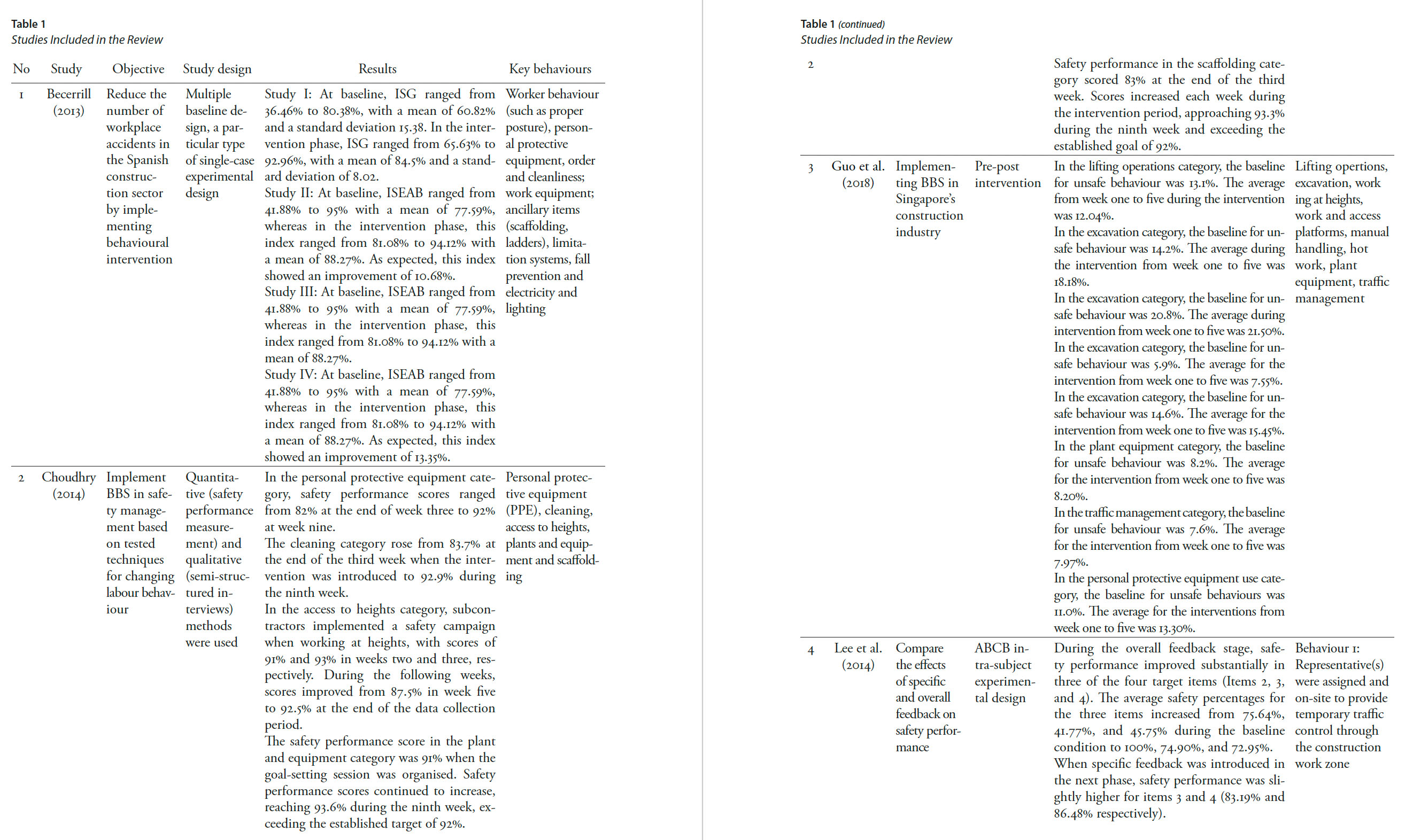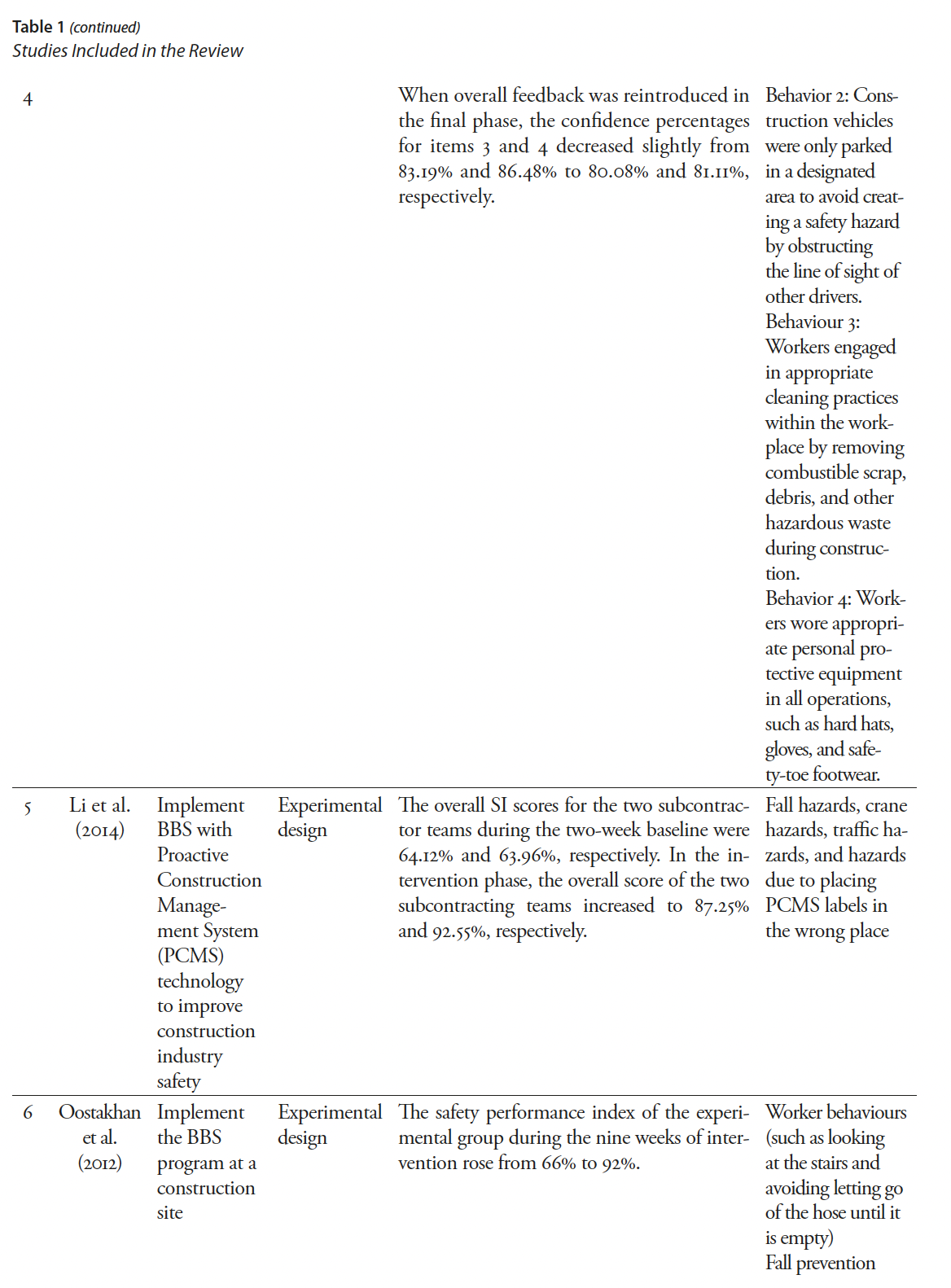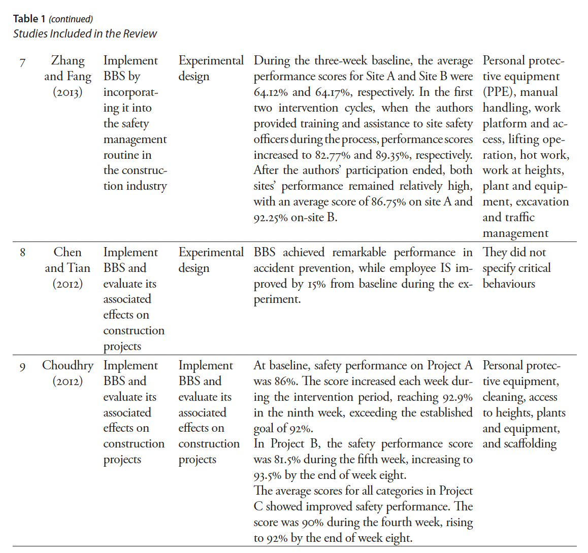 More than half the studies were conducted in China (Chen & Tian, 2012; Choudhry, 2012, 2014; Zhang & Fang, 2013; Li et al., 2015). These findings are similar to bibliometric studies, indicating that Asian countries have higher scientific production (Abd et al., 2021). In addition, some studies reported that they implemented BBS for eight (Choudhry, 2012), nine (Oostakhan et al., 2012) or 30 weeks (Guo et al., 2018). Other studies show a similar time range (Jiménez et al., 2011; Lingard & Rowlinson, 1997; Mattila & Hyödynmaa, 1998). These findings suggest that the length of time BBS is implemented depends on the possibilities and needs of each organization. However, this does not mean that behavioural techniques and procedures cease to be valid.