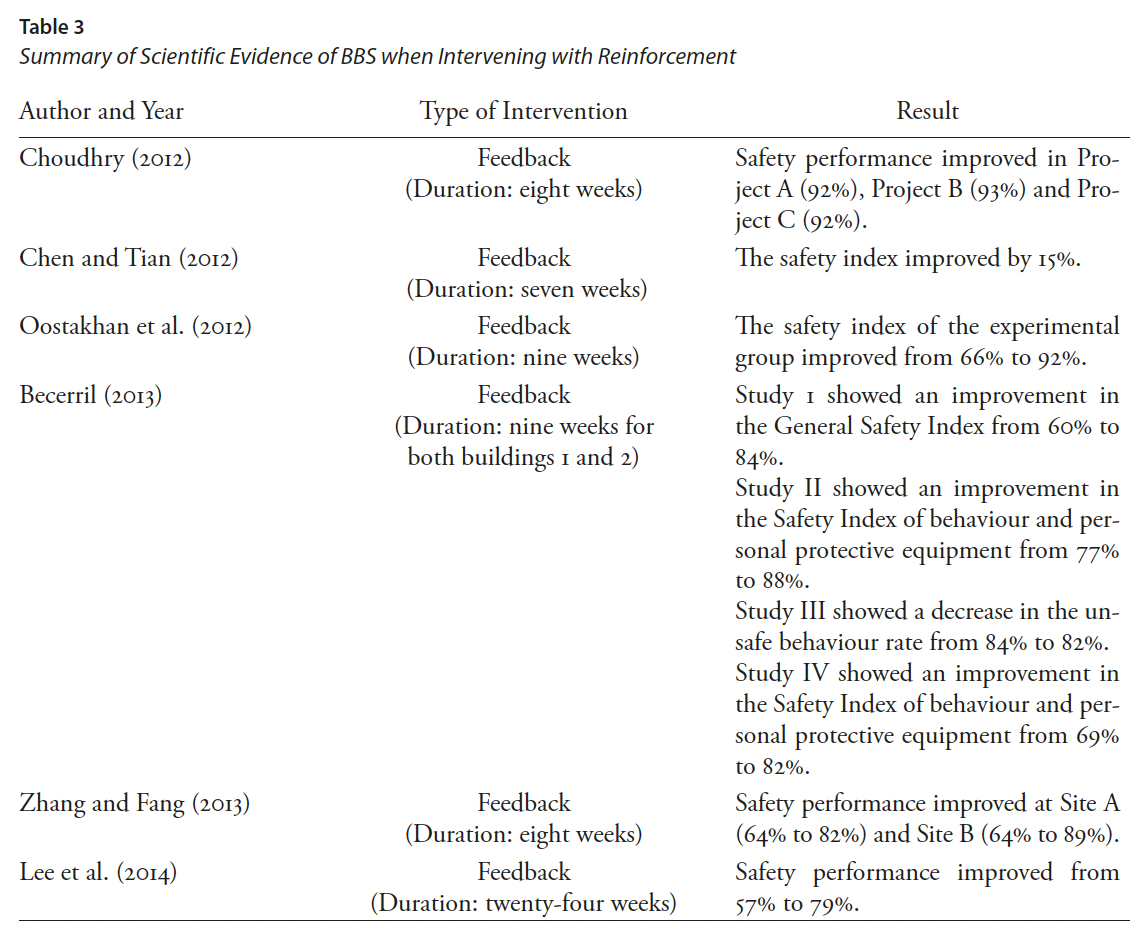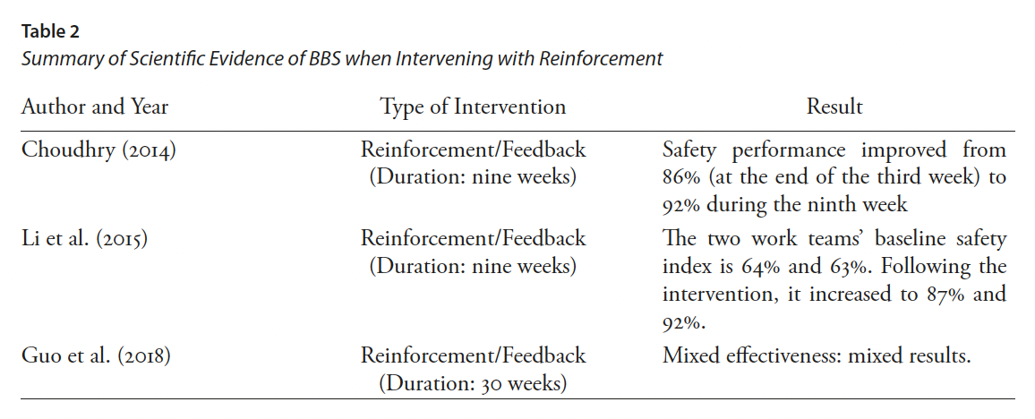 All the studies using BBS with feedback were found to be effective because they revealed a significant increase in safe behaviours. Previous reviews have shown similar results, highlighting the reinforcement of safe behaviours and decreased workplace accidents (Grindle et al., 2000; McAfee & Winn, 1989). BBS has proven to have a positive impact on increasing the use of personal protective equipment (Becerril, 2013; Choudhry, 2014; Lee et al., 2014; Zhang & Fang, 2013), order and cleanliness (Becerril, 2013; Lee et al., 2014) and heavy-load traffic management (Becerril, 2013; Guo et al., 2018; Lee et al., 2014).