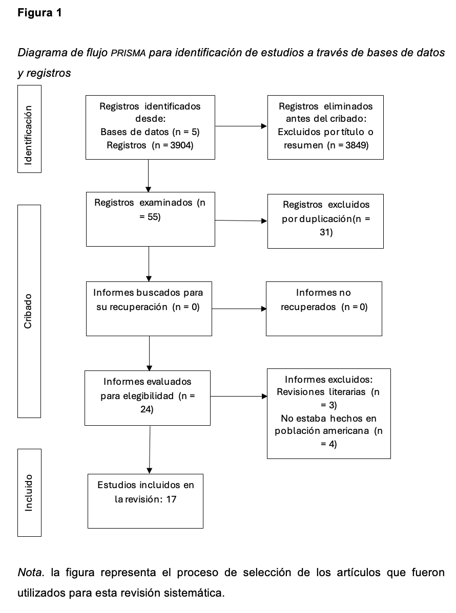 Las búsquedas en todas las bases de datos arrojaron un total de 3904 artículos, de los cuales se desecharon todos, con excepción de 55 con la revisión del título y el resumen. Después de eso, con el llenado del Excel, se descartaron otros 31 debido a que eran artículos repetidos. Al final, se leyeron de forma completa los 24 artículos para descartar siete, ya que no cumplían con los criterios de inclusión. Como resultado se tuvo un total de 17 artículos analizados para esta revisión sistemática, solo el 0.43% de los estudios encontrados inicialmente (Figura 1).