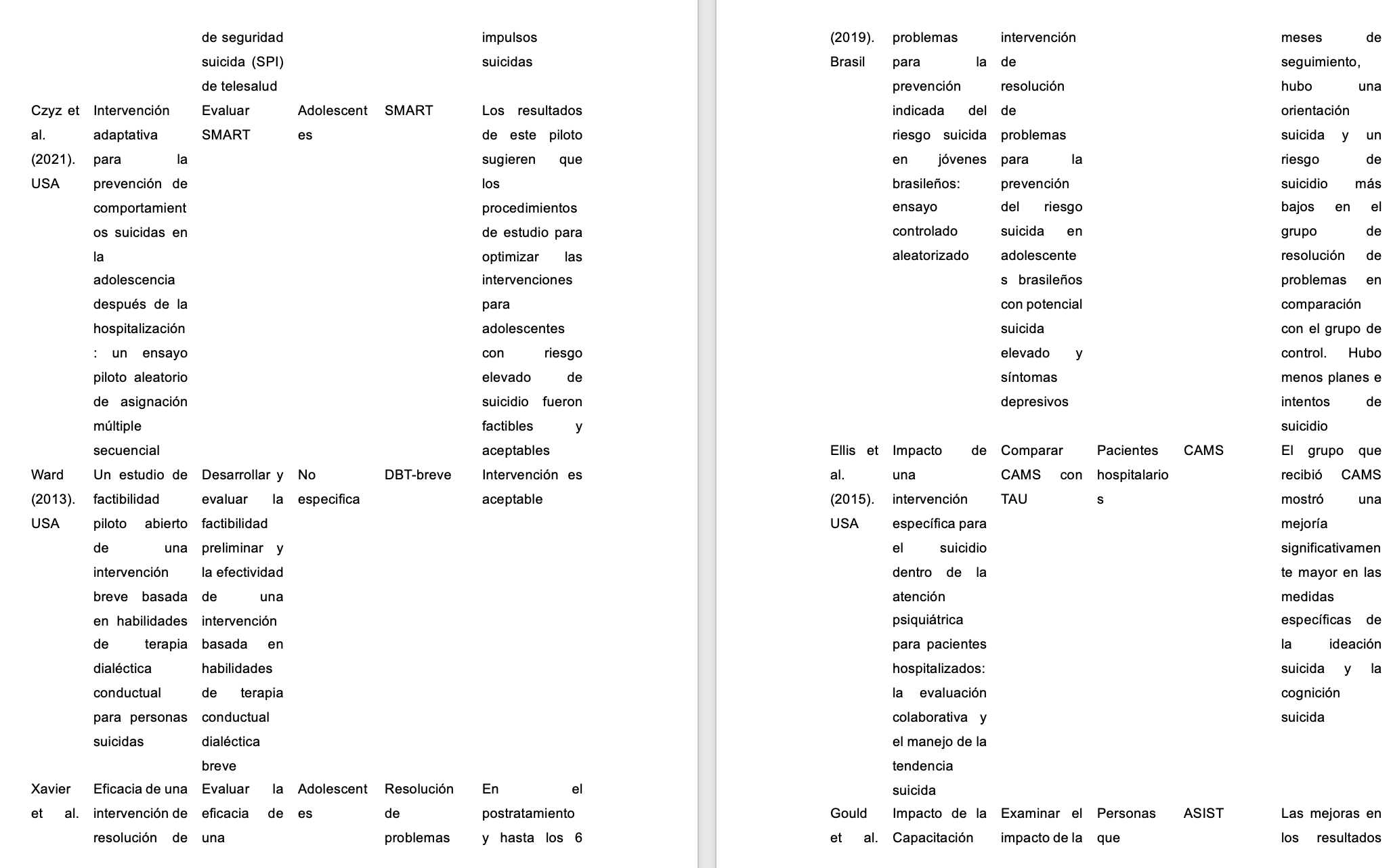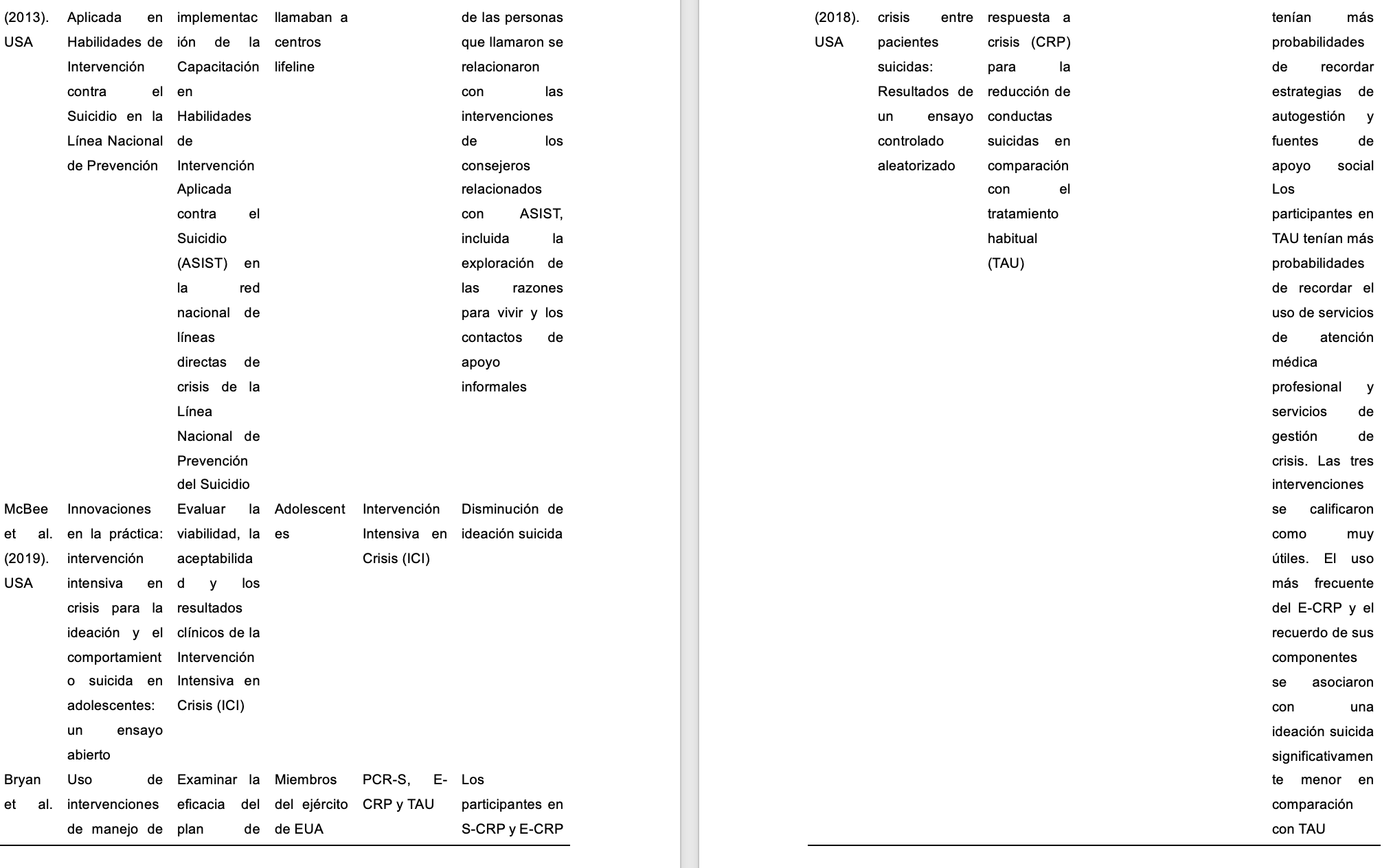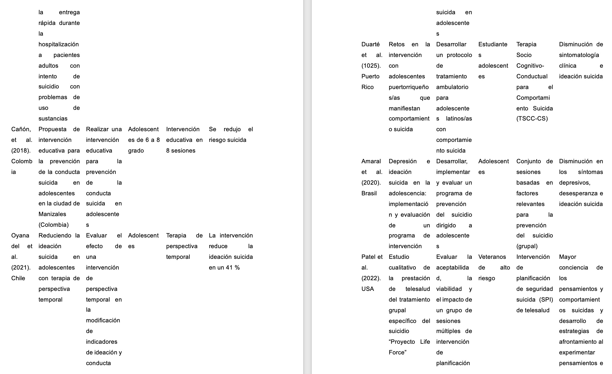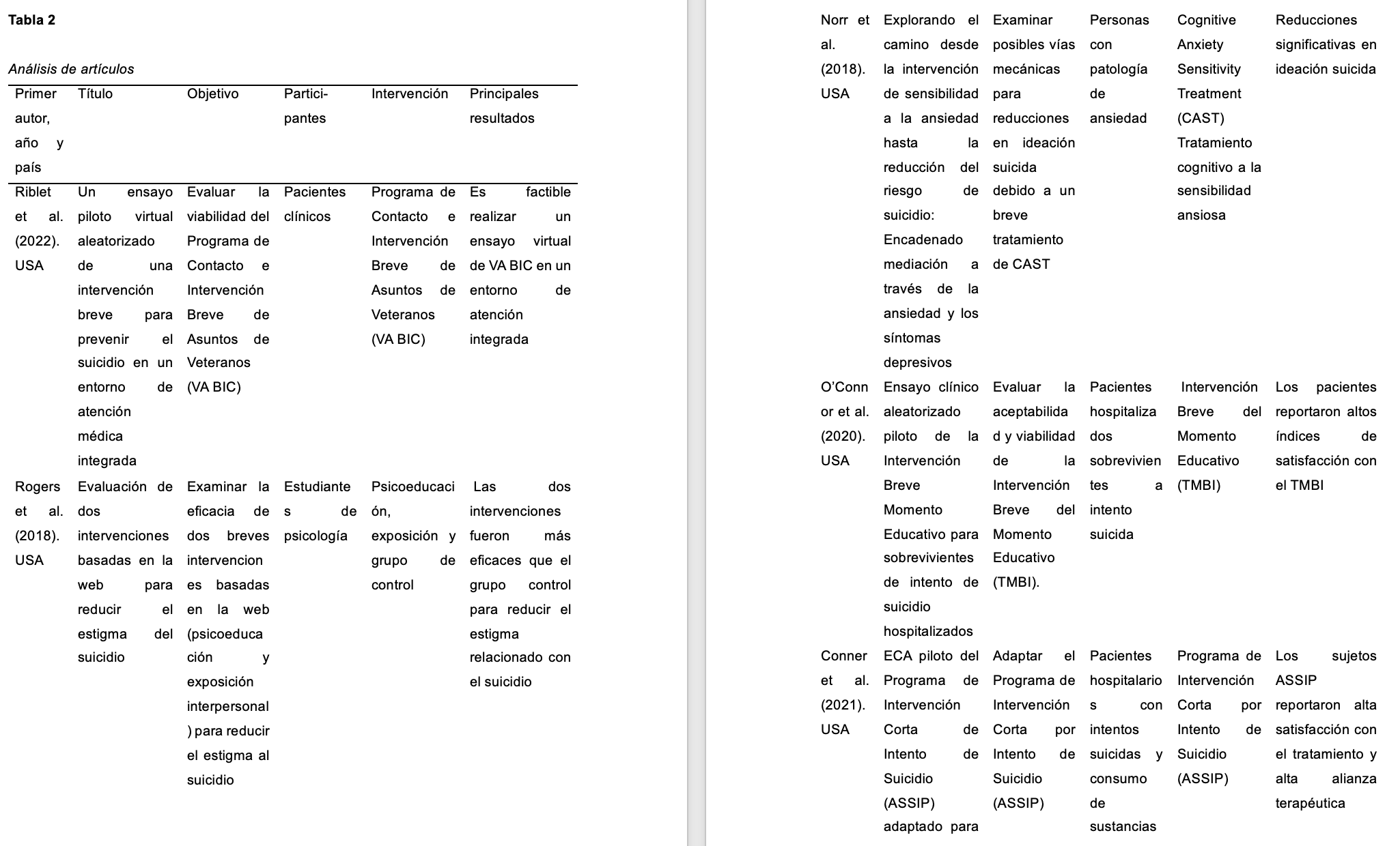 Dentro de las revisiones sistemáticas que se han realizado en relación con las intervenciones psicológicas y los comportamientos suicidas se encuentra el estudio de Leiman y Garay (2017), cuyo como objetivo era analizar la eficacia de distintas intervenciones en adultos de 18 a 65 años, encontrando que, de 13 estudios, la mayoría utilizaba estrategias cognitivo-conductuales y solo tres de ellos no fueron eficaces. Ningún estudio fue realizado en Iberoamérica.