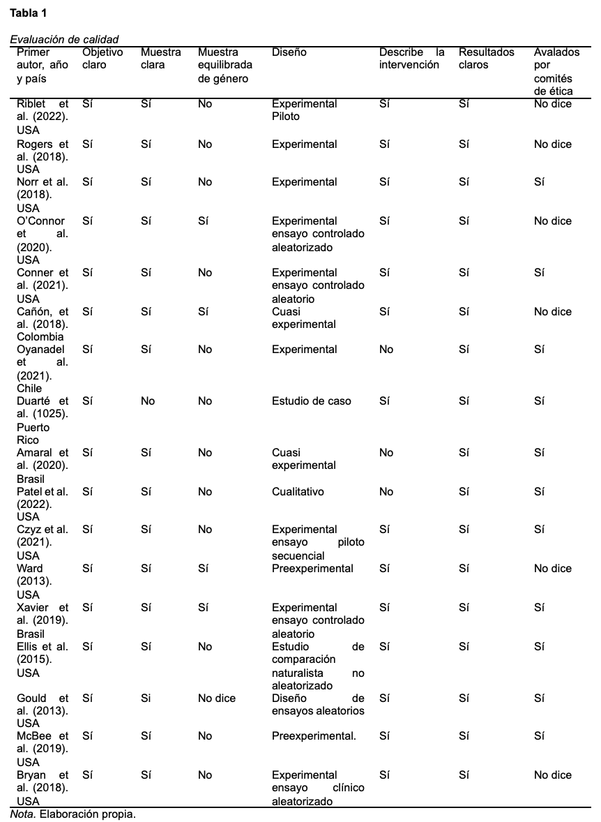 Otro de los puntos fundamentales es que la mayoría de estos estudios se realizó en Estados Unidos, lo cual señala una necesidad de investigar la implementación de diversas intervenciones en más países de Centro y Sudamérica. De los estudios analizados, solo dos se realizaron en Brasil; Chile, Colombia y Puerto Rico registraron uno por país. Esto no implica que no se hayan llevado a cabo, pero tal vez no se publicaron o no en revistas de amplia difusión, lo que complejiza la replicación, generación de evidencias de efectividad y ajuste al contexto particular.