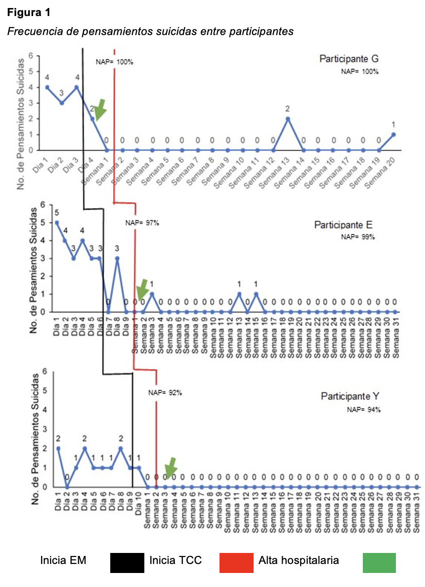 Se realizó la inspección visual de las gráficas, pues se sugiere que es el método más adecuado para el diseño de investigación utilizado, cuando los cambios son robustos (Kazdin, 2011, 2021). Para complementar la inspección visual de la frecuencia de pensamientos suicidas, se calcularon tamaños del efecto a través de dos índices nap (Non-overlap of All Pairs) (Parker & Vannest, 2009) para cada participante. El primero se obtuvo al comparar cada medición en la línea base con cada medición en la fase de em. En el segundo se comparó cada medición en la línea base con cada medición en la intervención completa (em + tcc). Es decir, se complementó la inspección visual de las gráficas con un cálculo de tamaño del efecto a través de un índice de no superposición, el índice nap (Brossart et al., 2014; Manolov & Tanious, 2024).